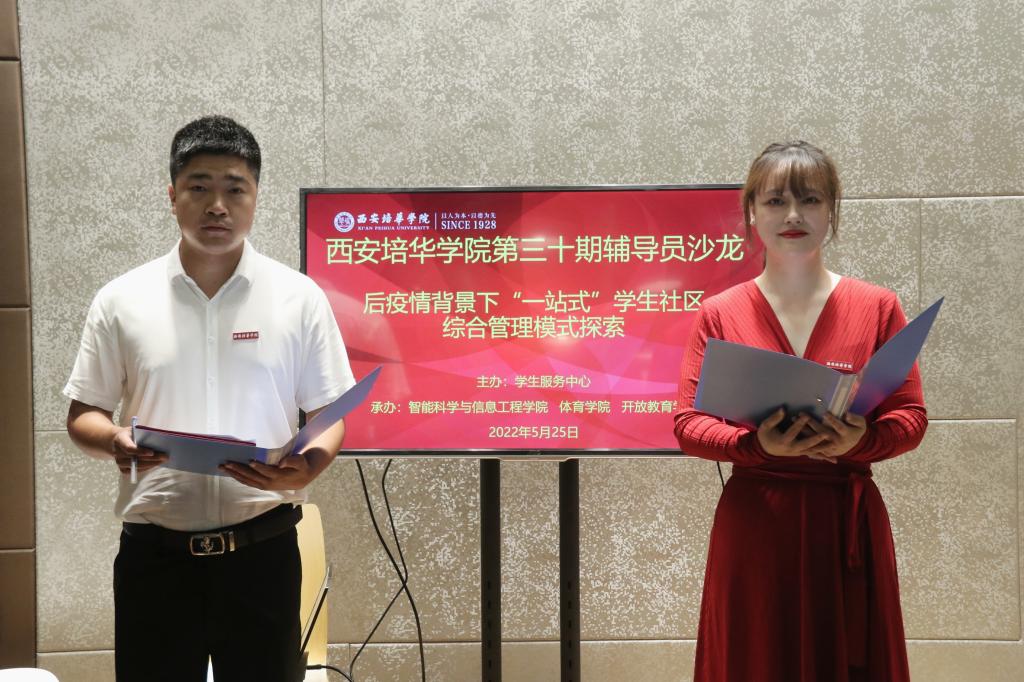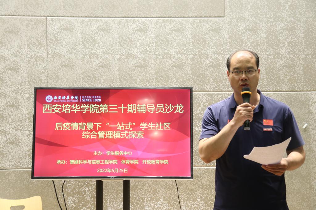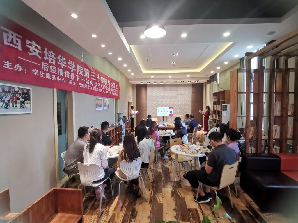 2022年5月25日,由学生服务中心主办,智能科学与信息工程学院、体育学院、开放教育学院承办的第三十届辅导员沙龙活动在辅导员之家举办。本次活动由智能科学与信息工程学院高珊珊老师,体育学院冯鑫老师主持。出席本次活动的嘉宾有:西安培华学院党委学工部部长、学生服务中心主任、校团委书记蔡亮、西安培华学院党委学工部副部长、学生服务中心副主任姚斌,传媒学院党委书记兼行政副院长江俊瑞,建筑与艺术设计学院党委书记兼行政副院长权勇太,体育学院党支部书记兼行政副院长马德厚,开放教育学院党支部书记兼行政副院长罗永辉老师,智能科学与信息工程学院党总支书记兼行政副院长南兵,医学院党委副书记何丽及各二级学院辅导员代表。