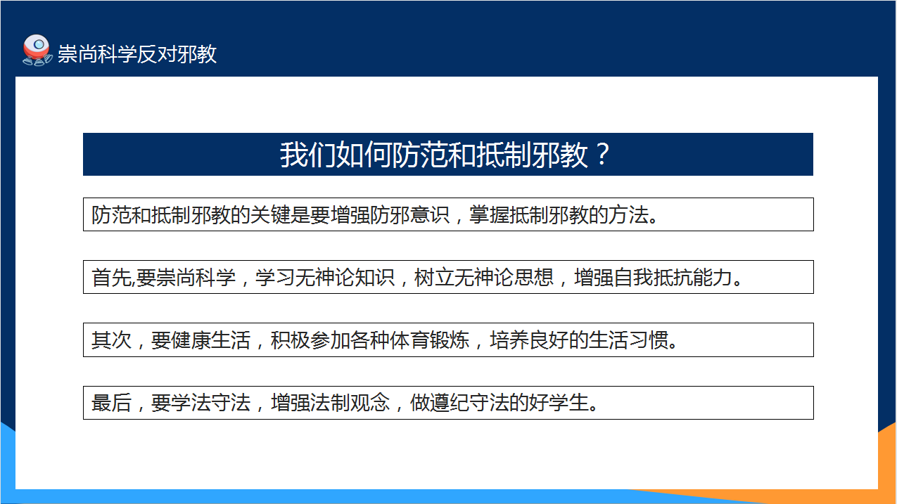 杨老师组织同学们主要从什么是宗教、如何认清邪教、遇到邪教活动怎么办、邪教的传播途径有哪些等多形式培养学生正确了解宗教、识别邪教、抵御邪教,意识到了邪教的危害性,掌握基本抵制邪教的方法,增强自我保护的意识。