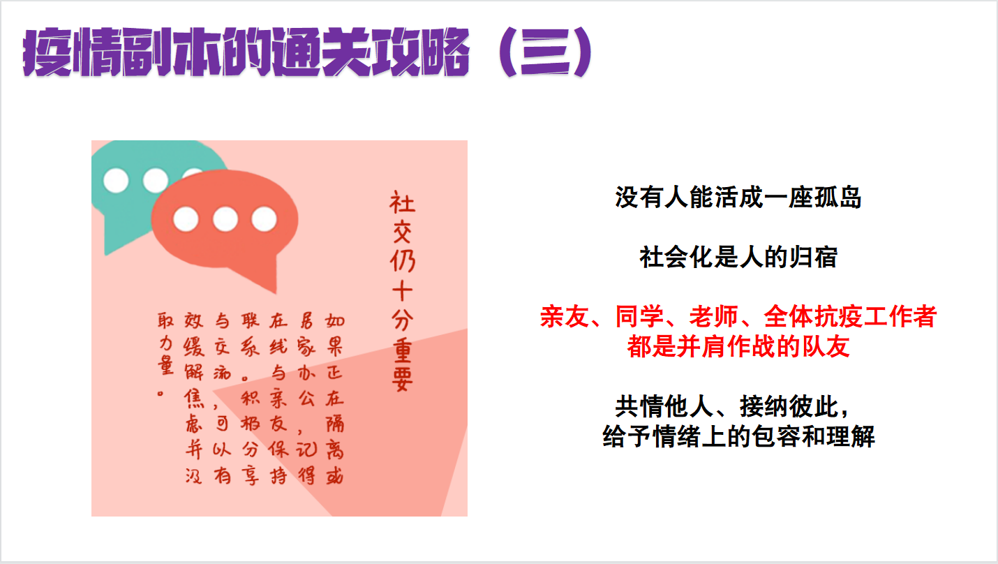 新冠来袭,新的游戏副本关卡,疫情副本给同学们的生命游戏带来了学习、生活、人际交往方面的变化,但同时也成为了成长的契机,要学会对疫情有合理的预期,同时接纳自己的负面情绪,才能更好应对现在疫情的挑战。
