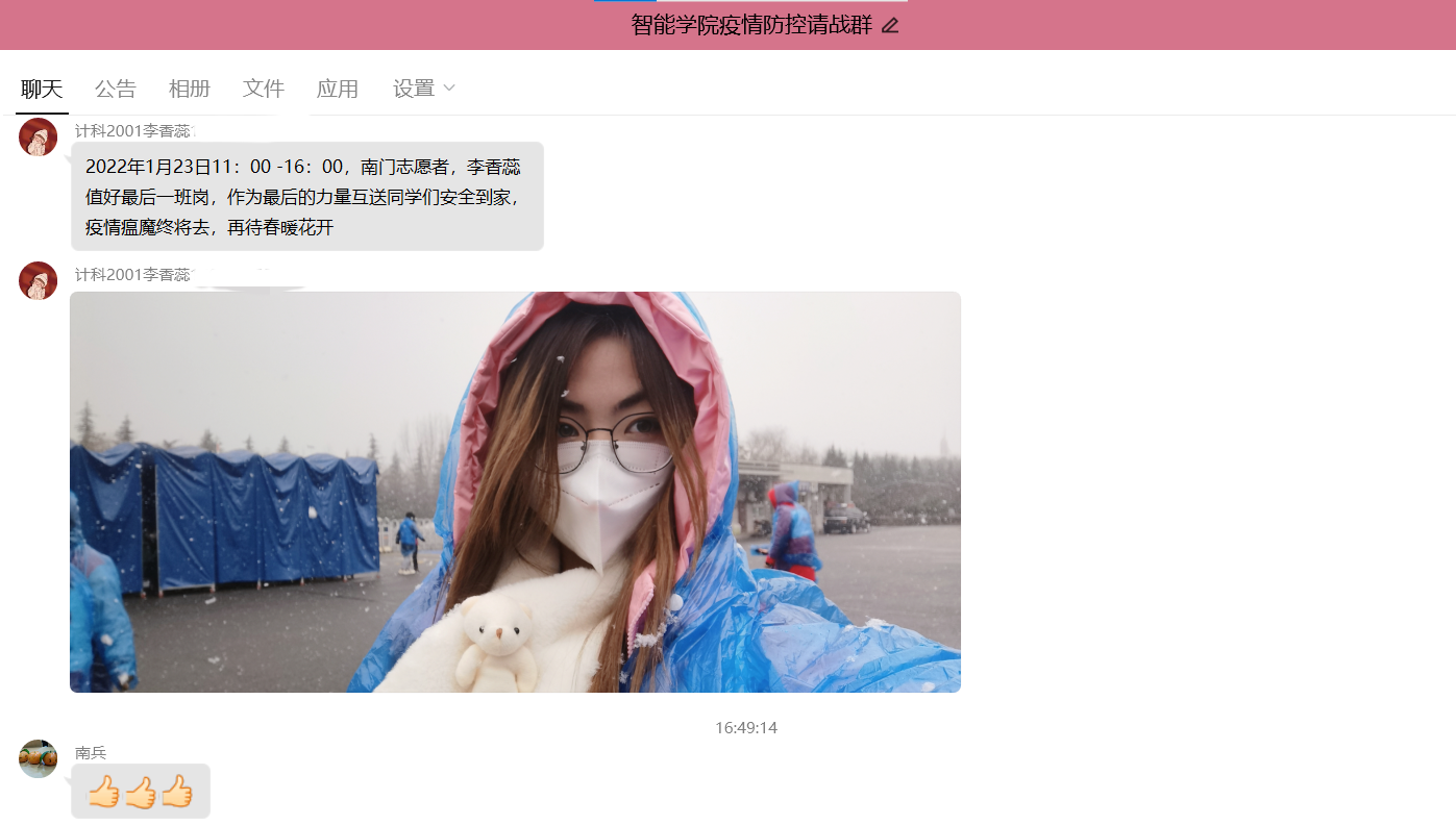 李香蕊的主要工作是在体育场维持好同学们做核酸的秩序,引导同学们间隔排队有序的进行核酸检测。在疫情得到缓解后,同学们也即将踏上返乡之路,为保障同学们顺利返乡,李香蕊又加入到返乡保障志愿工作中,为选择网约车返乡的同学们保驾护航,无论风雪仍然坚持到最后一班岗。