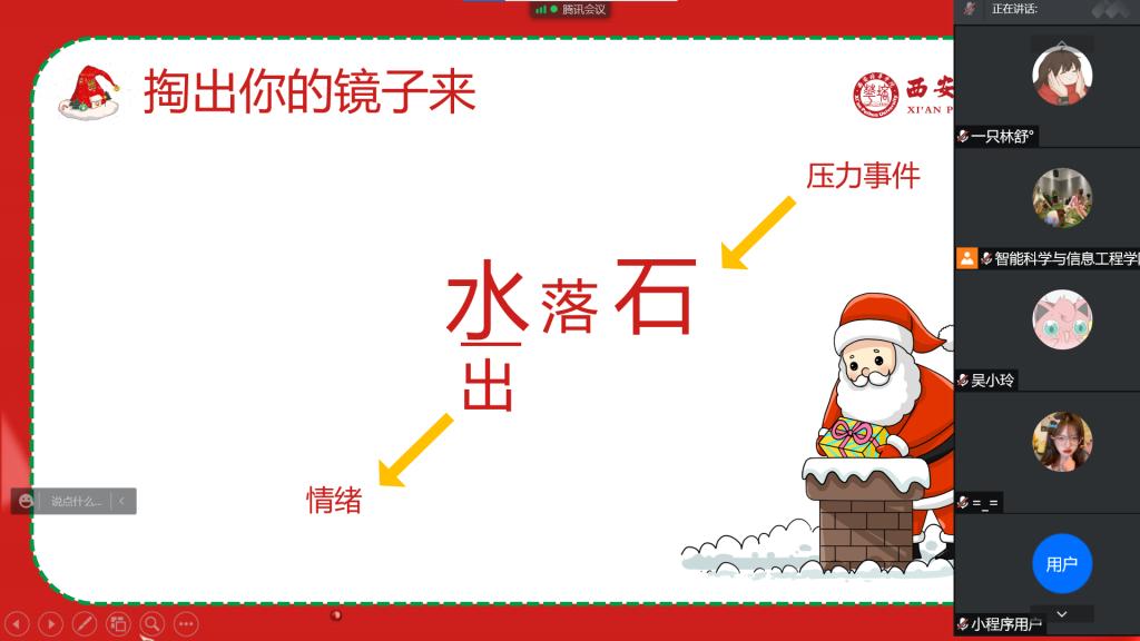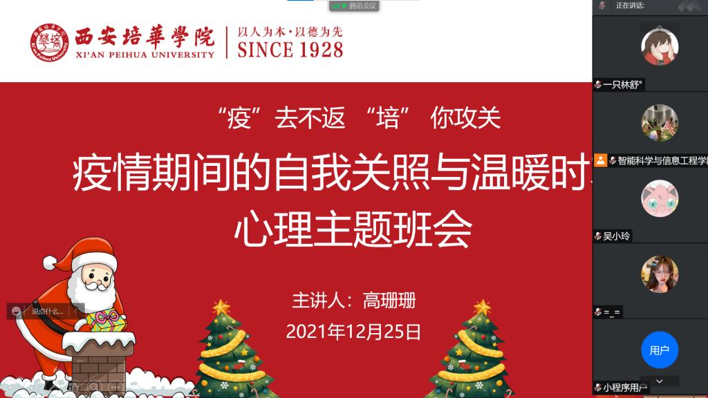 自疫情防控让城市“静”下来,校园的教学楼没有往日的人来人往,广大师生“蜗居”在宿舍内,一天中的放风时间大概就是出门做核酸。大家的心理压力随着春节到来也愈来愈大,都在担心自己是否能如期放假、是否能回家和家人团聚。就目前形势而言,疫情已经得到有效控制且物资储备充足,完全没有必要去焦虑和恐慌。本次会议就是让大家意识到,当你无法改变环境时,就要学会去接受,帮助大家提高心理防护能力,以乐观向上的心态过好每一天。