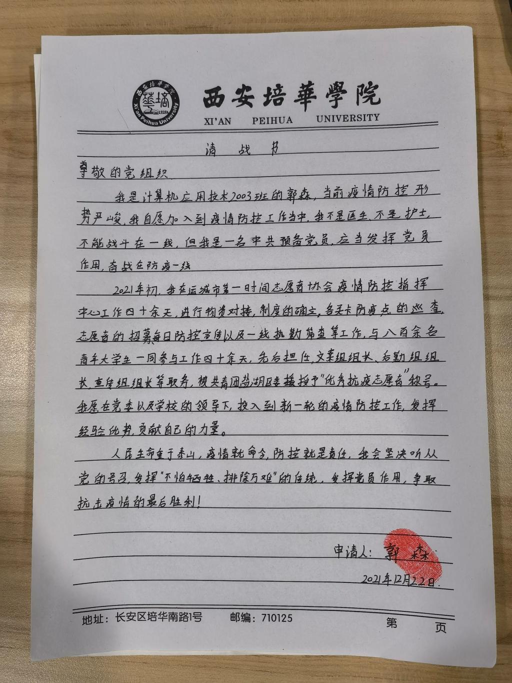 当下的西安面临着严重的疫情,整个城市都暂停了下来。作为一名光荣的中共预备党员,在第一时间向党组织递交了“请战书”,投入疫情防控工作,争做“责任人”,积极报名加入到疫情防控的工作中,“青”力而为,让青春力量在这场战“疫”中闪光!