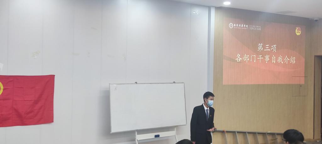 各部门干事上台做自我介绍,同时明确各自部门工作内容以及未来工作方向,都表示作为团委的一员,则更应该做好部门带头作用,踏实负责,增强工作中的凝聚力,加强各部门团结意识,促进学风以及校风的进一步发展,努力建设和谐的氛围,创建更好的团委大家庭!
