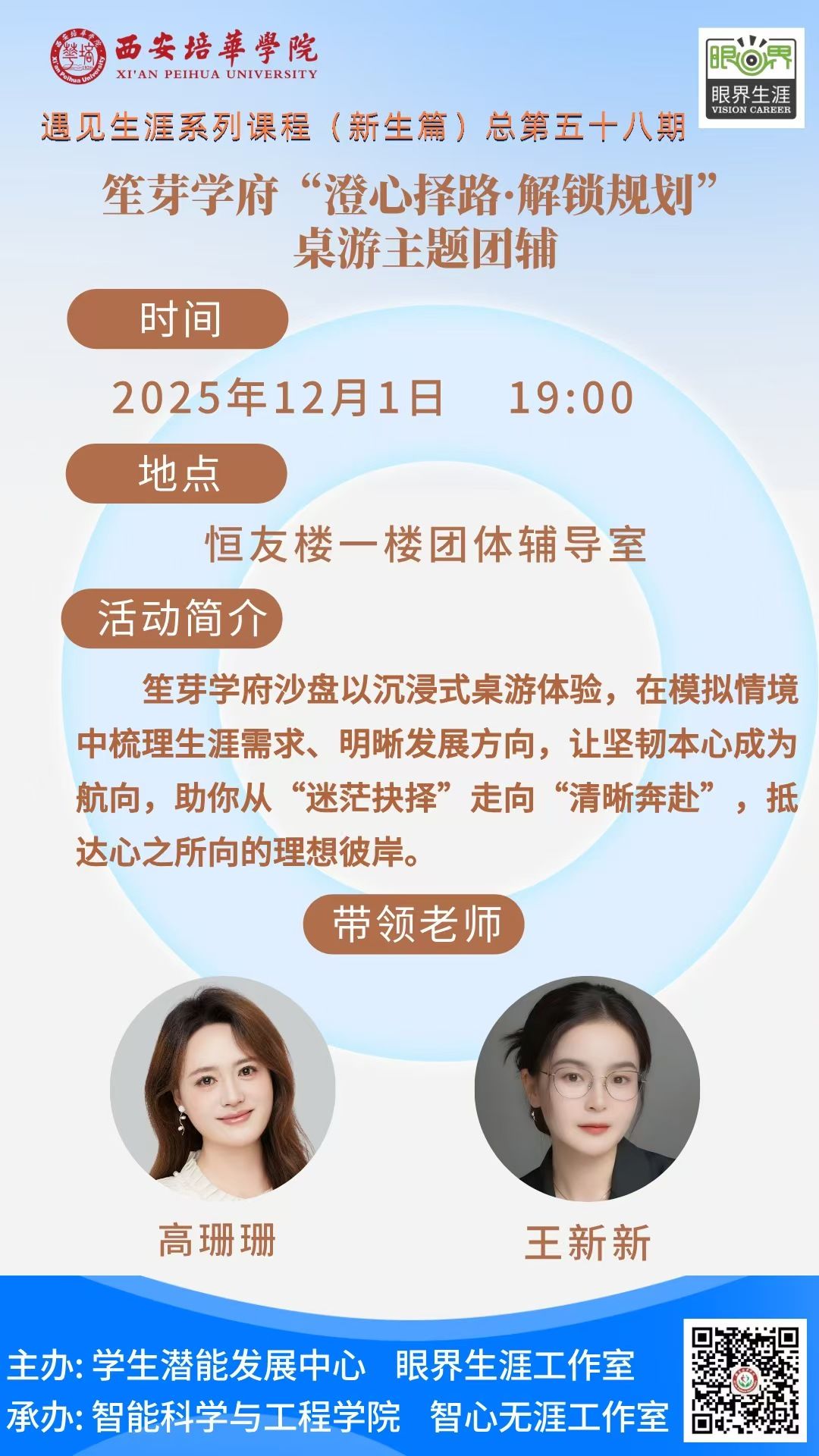 为帮助新生明晰大学发展方向,科学规划生涯路径,2025年12月1日西安培华学院遇见生涯系列课程(新生篇)总第五十八期 “心启征途,锚定未来” 桌游主题团辅活动在恒友楼一楼团体辅导室顺利开展。本次活动由学生潜能发展中心、眼界生涯工作室主办,智能科学与工程学院智心无涯工作室承办,高珊珊、王新新两位老师共同带领,智能科学与工程学院25级新生代表参加。