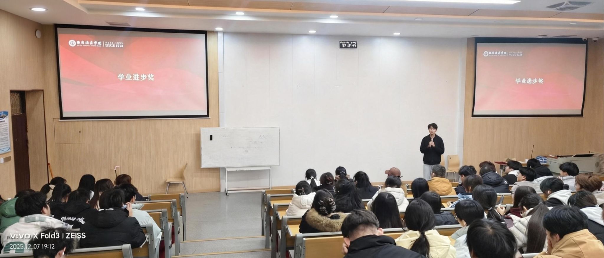 在各班班会上,辅导员首先向获奖同学表示祝贺,充分肯定了他们通过自身努力取得的显著进步。他们表示,学业进步奖旨在鼓励每一位在学业上持续投入、不断超越的同学,希望获奖者能发挥榜样作用,带动身边同学共同成长。同时,辅导员们也鼓励全班同学以获奖同学为参照,找准自身定位,制定合理目标,在新阶段取得新进步。