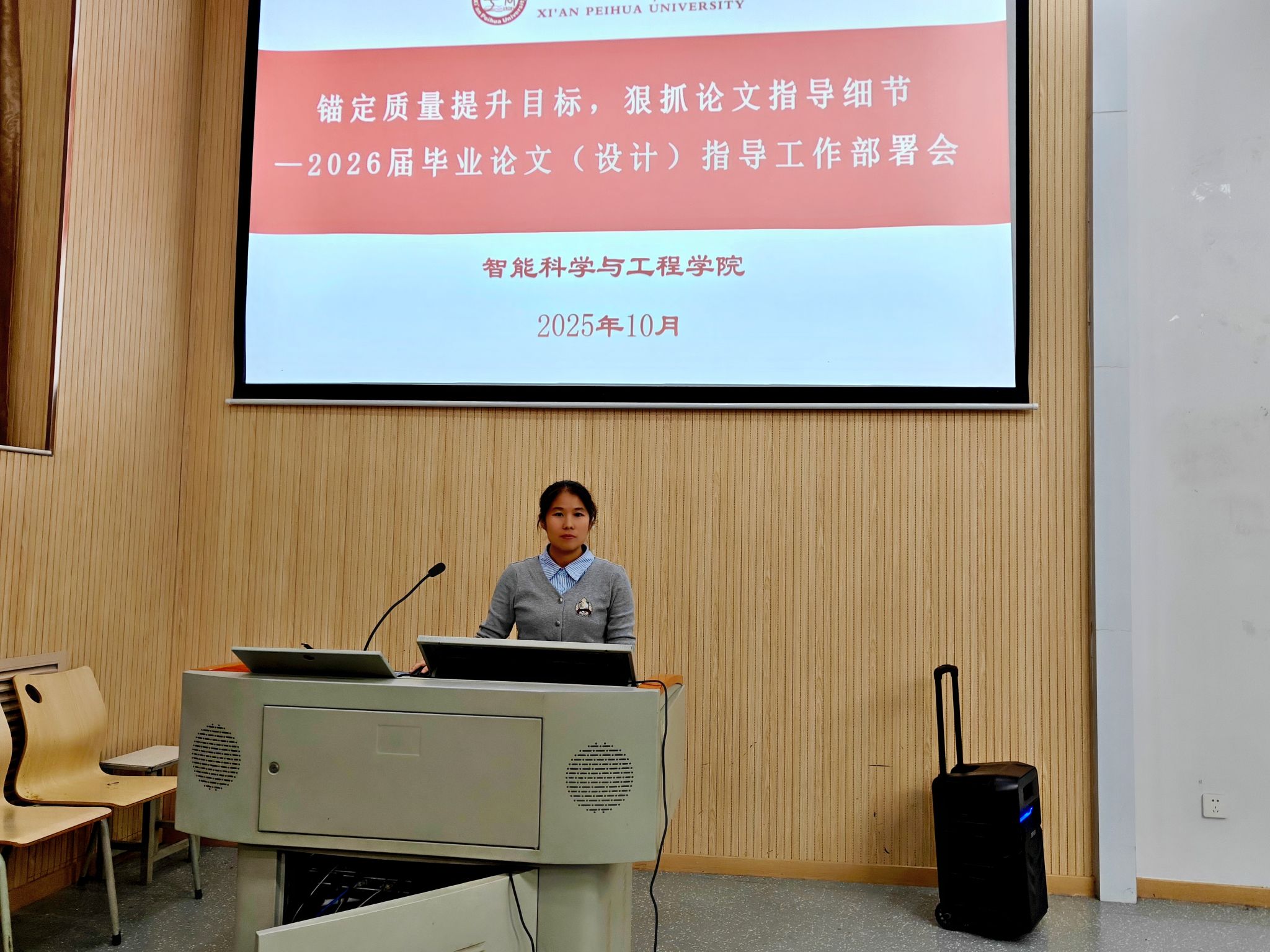 为切实提升2026 届本科毕业论文(设计)质量,明确论文指导各环节工作要求,确保毕业论文(设计)工作有序、高效推进,10月23日,学院组织召开审核评估工作推进会暨 2026届毕业论文(设计)指导工作部署会。会议由常务副院长成立主持,全体院领导、系主任、专业负责及全体教师参会。