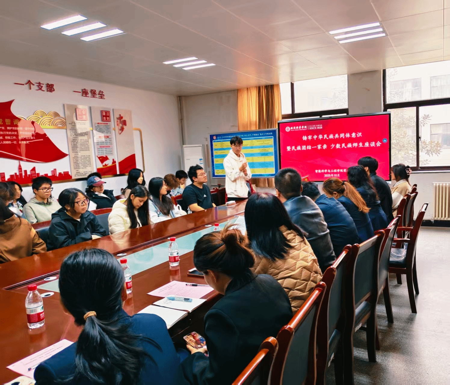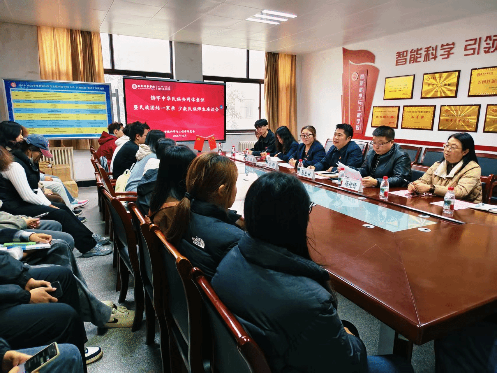 为铸牢中华民族共同体意识,营造民族团结一家亲的良好育人氛围,10月21日,我院在学院党员活动室召开铸牢中华民族共同体意识暨民族团结一家亲 少数民族学生座谈会。学院党委副书记屈松林,党委委员李萌、杨锦,学生干事杨桂锋,2025级新生辅导员及30名少数民族学生代表参会。