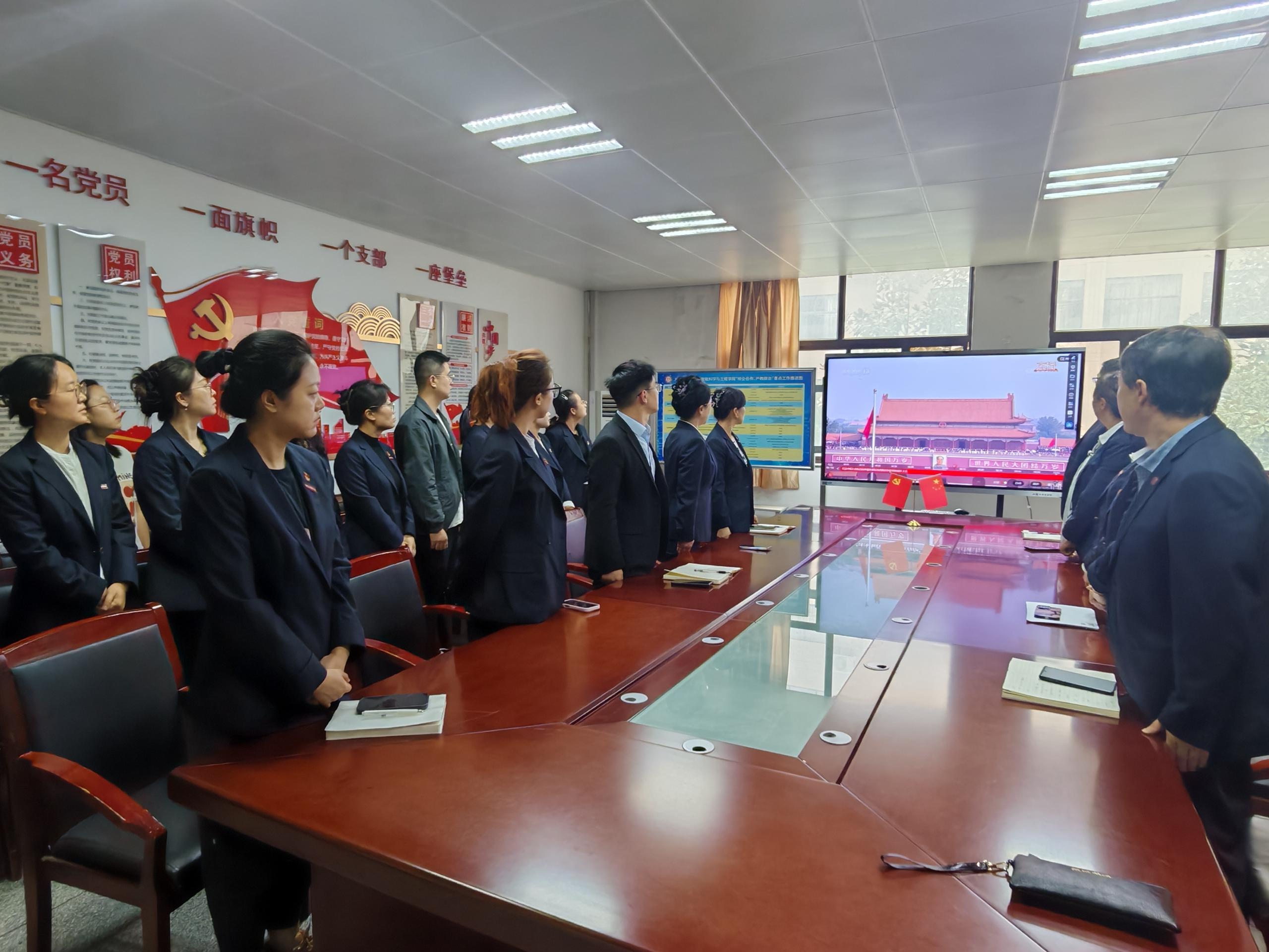上午9时整,大会正式开始。电视直播中,天安门广场上80响礼炮响彻云霄,伴随着雄壮的《义勇军进行曲》奏响,大家全体起立,齐唱中华人民共和国国歌,共同注视着鲜艳的五星红旗冉冉升起。阅兵队伍的空中护旗梯队、徒步方队、战旗方队、装备方队、空中梯队依次通过天安门广场,集中观看直播现场掌声雷动,整齐的阵容、豪迈的气势、先进的武器装备让大家倍感自豪、赞叹不已,由衷为伟大祖国感到骄傲。