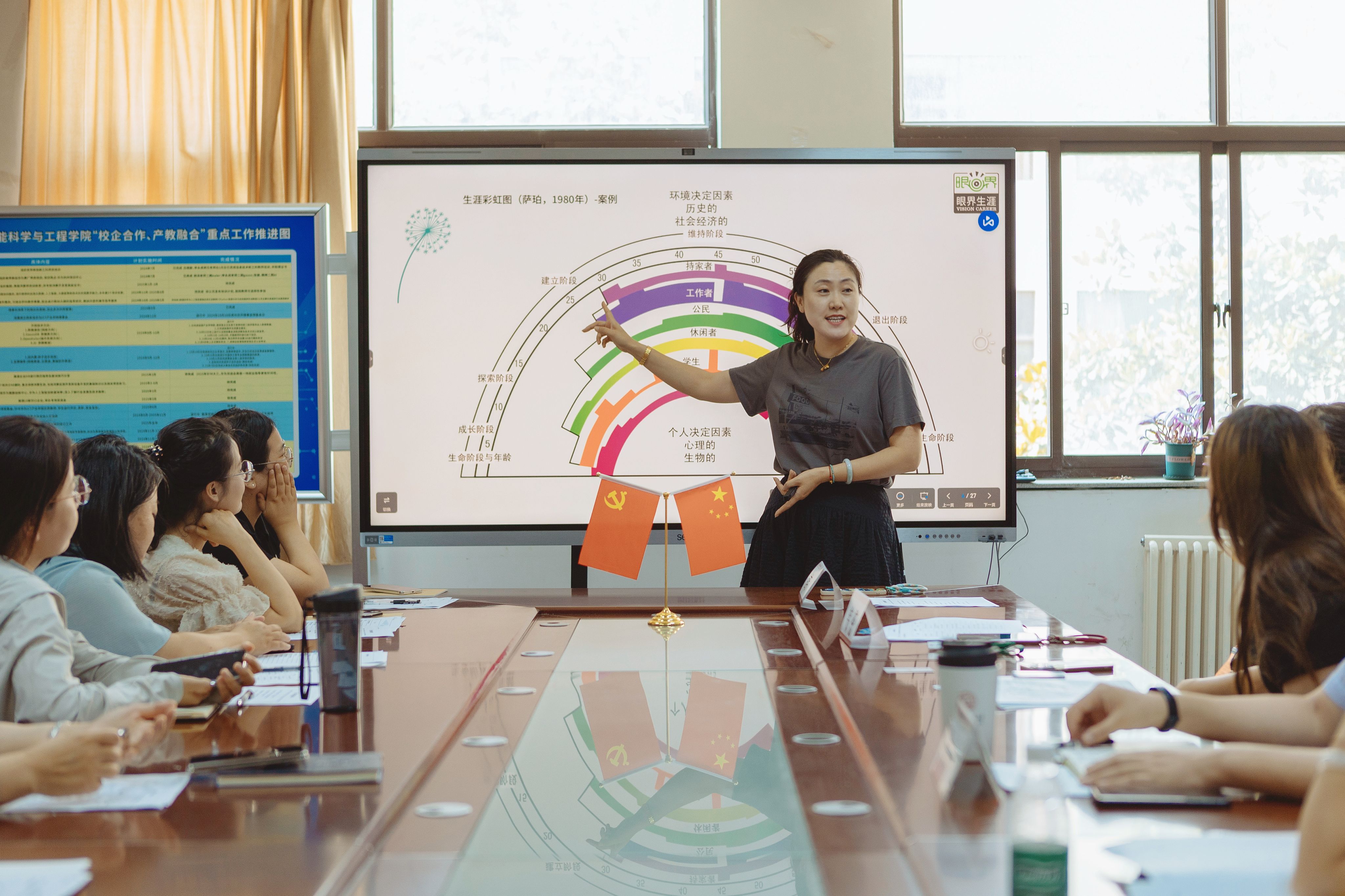 韩赟老师聚焦不同学段学生在自我认知模糊、生涯规划迷茫、时间管理无序、目标设定失准、决策能力薄弱等五大典型问题,深入研究教育心理学、生涯规划理论,创新推出涵盖自我探索、决策规划、时间管理等维度的“十大核心工具”。培训中,她以生动形象的生涯彩虹图为引,引导学生梳理人生发展脉络,清晰勾勒不同阶段的角色与任务;用生涯九宫格帮助学生建立平衡思维,在学业精进与生活体验间寻找黄金分割点。借助三叶草模型层层解析职业兴趣、能力与价值的动态关系,运用十字决策模型帮助学生理性权衡利弊。通过时间矩阵管理将学习任务科学分类,结合每日三件事法则,逐步培养学生聚焦核心目标的良好习惯。