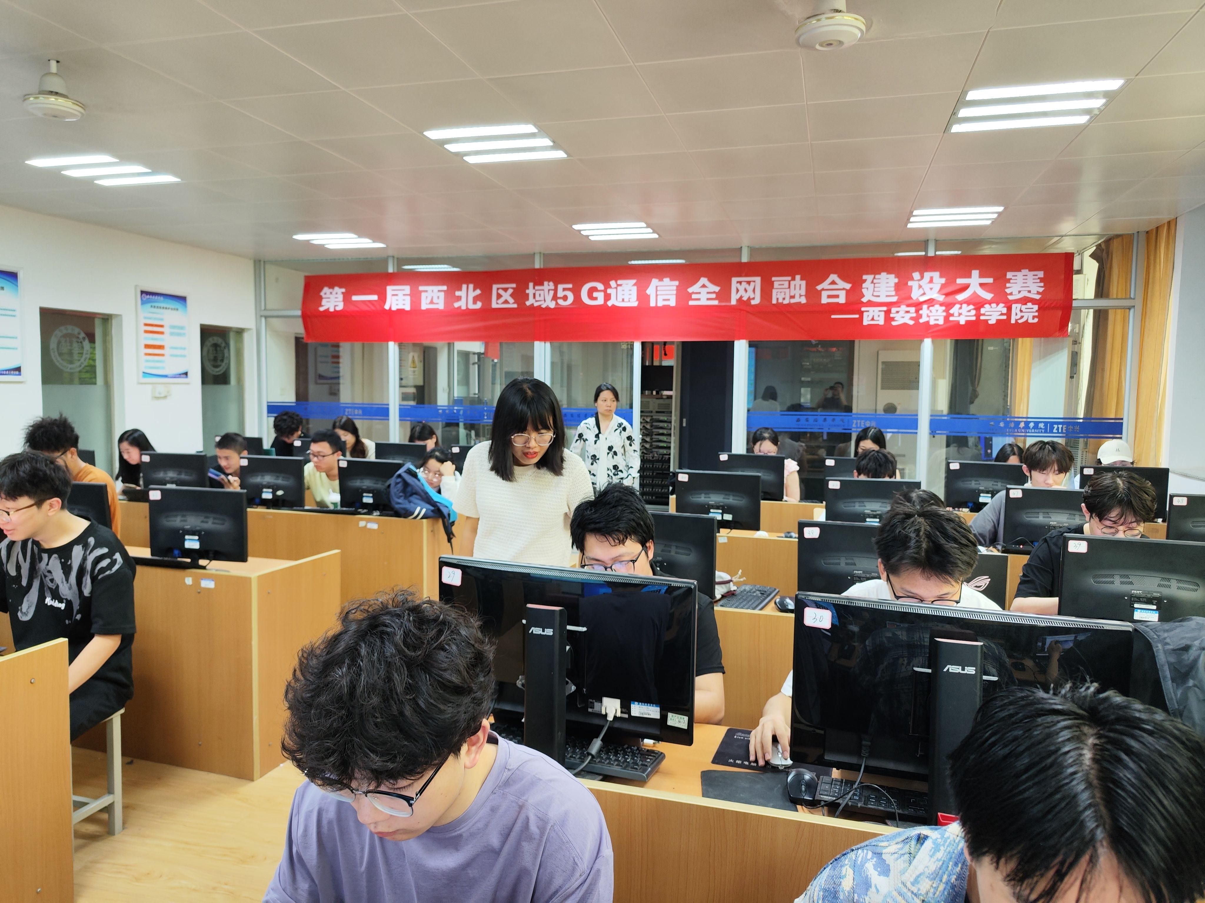 第一届西北区域5G通信全网融合大赛西安培华学院赛点于2025年5月17日8:30到12:00在3116举行。本次大赛是由陕西省通信学会主办,西安科技大学通信与信息工程学院、西安理工大学自动化与信息工程学院联合承办,南京柯姆威公司提供仿真平台支持。有西北区域的西安科技大学、西安工业大学、西安培华学院等20多所高校参加。