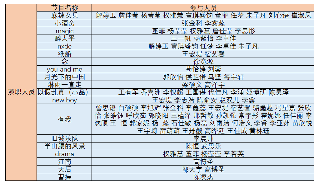 2023年12月21日晚,西安培华学院智能科学与信息工程学院在大学生活动中心中举办了 “智信庆新元 龙腾谱新篇”2024元旦晚会暨格物学生社区联欢晚会。本次晚会的圆满完成,离不开所有演员、工作人员、观众以及各位领导老师的付出与支持。为此,共青团西安培华学院智能科学与信息工程学院委员会决定对本次晚会表现突出的演职人员和工作人员进行公开表彰。表彰名单如下: