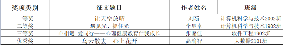 为深入了解我院大学生心理健康教育与咨询工作成效,深入推进大学生心理咨询服务工作发展,同时引导大学生提升自我觉察力与感受性,积极关注心理健康,促使同学们倾听内心的声音,表达真实的情感,灵活地运用心理健康知识,帮助自己更好地调节心理状态,并以此启发影响他人,2022年6月15日,由智能科学与信息工程学院主办的第二届“心相遇 爱同行——心理健康教育伴我成长”主题心理征文活动圆满结束,本次共征集作品20篇,评选出4篇优秀作品。