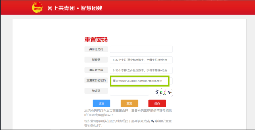 [1]忘记密码可以点击上图页面中的“忘记密码”进入如下页面进行修改密码,重置密码需要组织管理员(团支书)提供的“重置密码验证码”毕业生团员个人自行联系团支书向其申请重置密码验证码。