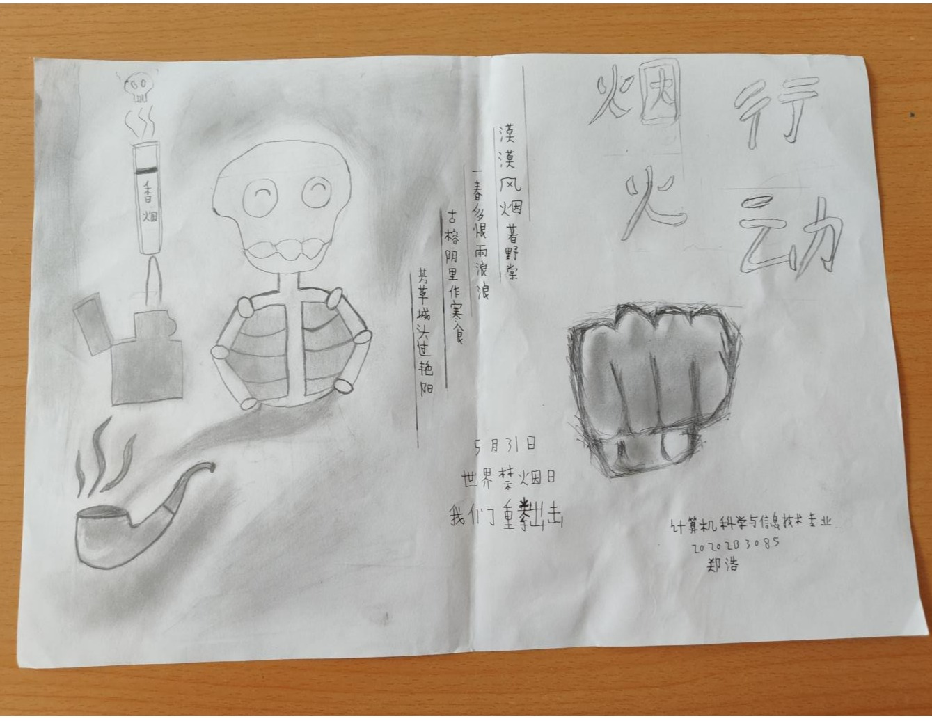 烟草依赖是一种慢性疾病,烟草危害是世界最严重的公共卫生问题之一,吸烟和二手烟问题严重危害人类健康。2021年5月31日是第34个世界无烟日。为加大控烟宣传和健康教育力度,智能科学与信息工程学院青年志愿者协会开展了以“远离香烟,珍爱生命”为主题的征集画稿活动。