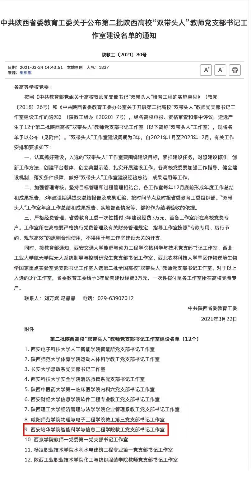 近日,陕西省教育厅公布第二批陕西高校“双带头人”教师党支部书记工作室建设名单。智能科学与信息工程学院教工党支部书记工作室获批陕西高校“双带头人”教师党支部书记工作室建设。本次入选陕西省高校“双带头人”教师党支部书记工作室建设名单,是陕西省委教育工委对学院教工党支部工作的充分肯定,也是我院党建工作取得的又一项重大成果。