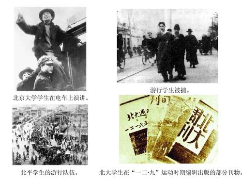 1935年12月9日,北平(北京)大中学生数千人举行了抗日救国示威游行,反对华北自治,反抗日本帝国主义,要求保全中国领土的完整,掀起全国抗日救国新高潮。12月12日,北平学生举行第5次示威游行,高呼"援助绥远抗战"、"各党派联合起来"等口号。这是中国共产党领导的一次大规模学生爱国运动。