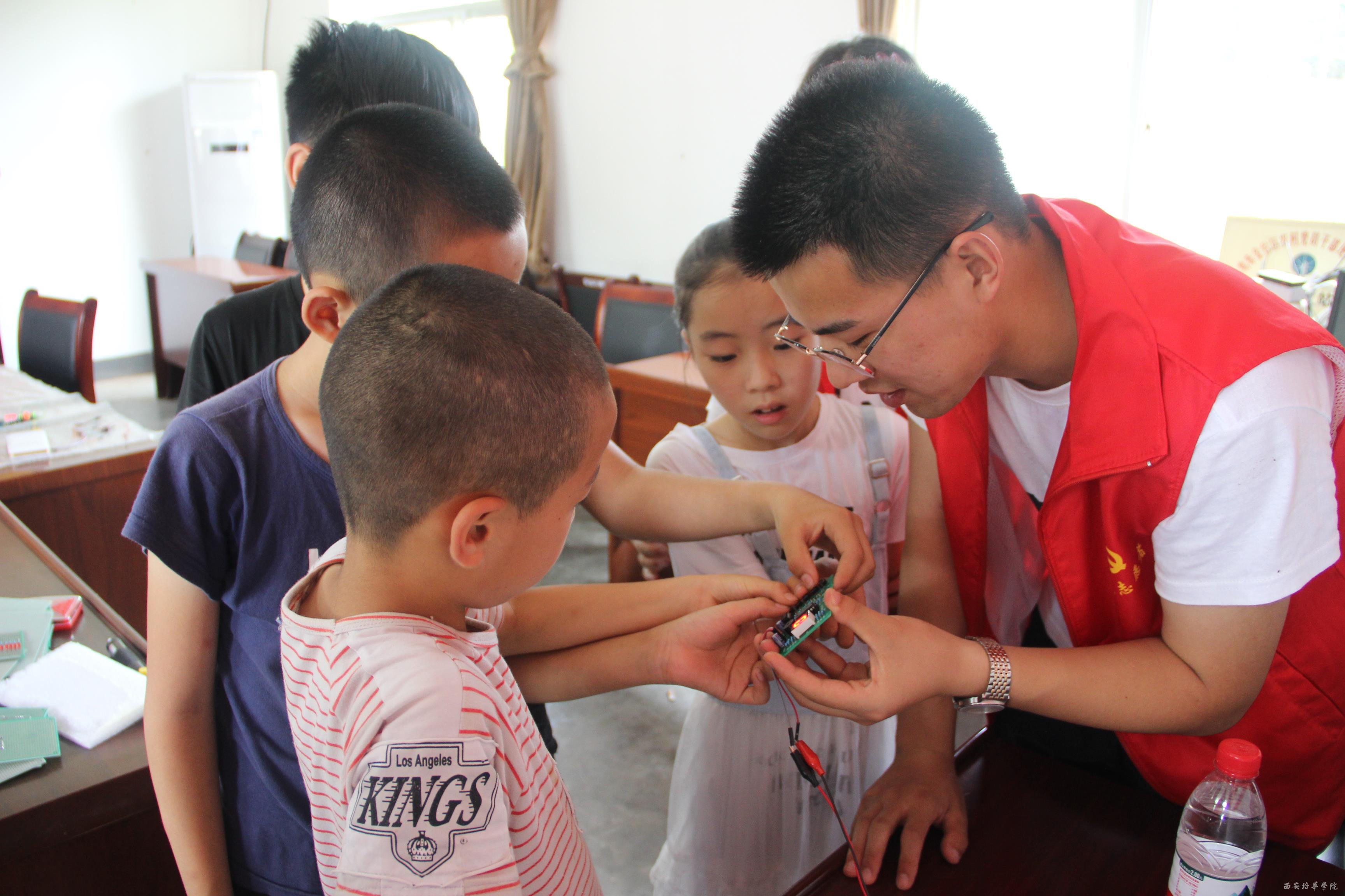 服务队组织车辙村青年于村委会办公室为青少年讲解科技产品在生活中的实际运用,同时展示团队带去的各类科技小产品,并用更通俗的语言为他们讲解错综复杂的电路、程序设计,结合实际情况让他们亲自动手实践,在实际操作中体验科技带来的乐趣,引导他们探索科学技术的魅力,激发激发对科技知识的渴望。