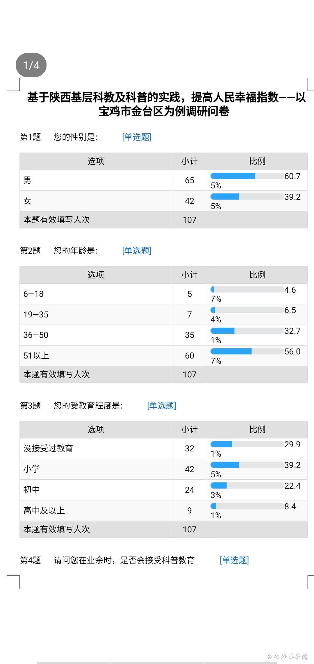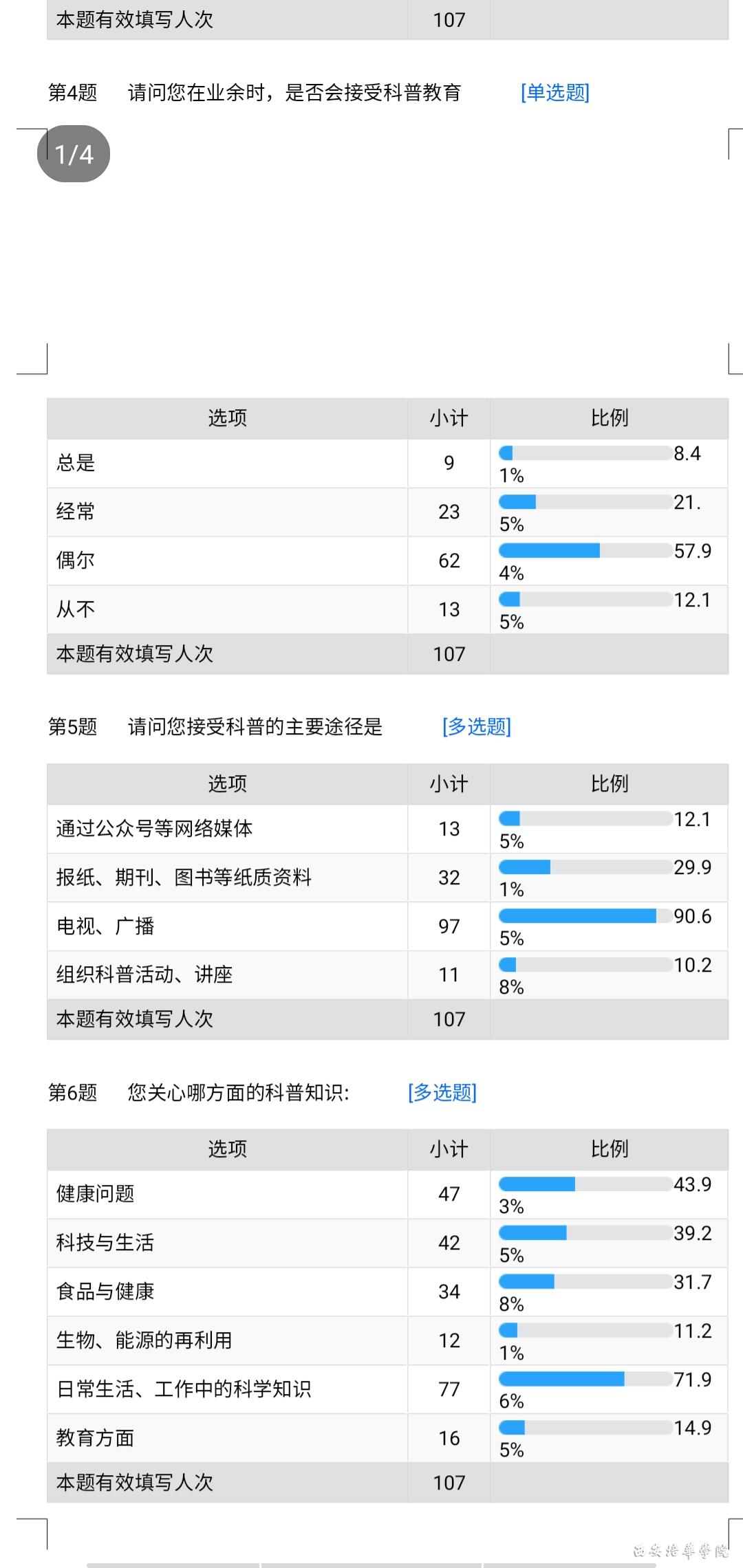 总计调研问卷107份,数据显示,车辙村90.6%的村民接受科普的主要途径是通过电视和广播;71.9%的村民更关心日常生活、工作中的科普知识,43.9%的村民关心健康问题上的科普知识,39.2%的村民关心科技与生活方面的科普知识,而对于生物、能源、教育方面的科普知识占比较小;车辙村有81.3%的村民认为脱贫攻坚需要融入于科技创新中,并有98.9%的村民对车辙村脱贫攻坚工作表示满意。通过交谈还了解到,车辙村村民在做饭方面使用到的科技产品较多,对于科技的了解也仅仅局限于电视、手机以及日常生活用品。