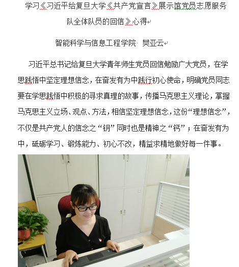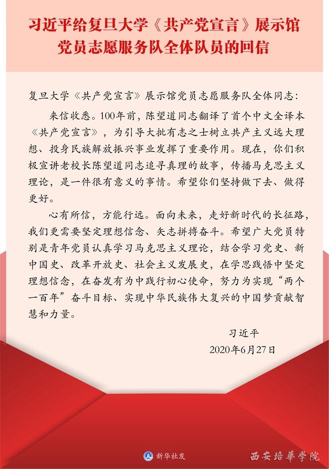 6月上旬,复旦大学《共产党宣言》展示馆“星火”党员志愿服务队全体队员给习近平总书记写信,汇报参加志愿讲解服务的经历和体会,表达做《共产党宣言》精神忠实传人的信心和决心。令他们惊喜的是,习近平总书记近日给全体队员回信,勉励他们继续讲好关于理想信念的故事,并对全国广大党员特别是青年党员提出殷切期望。