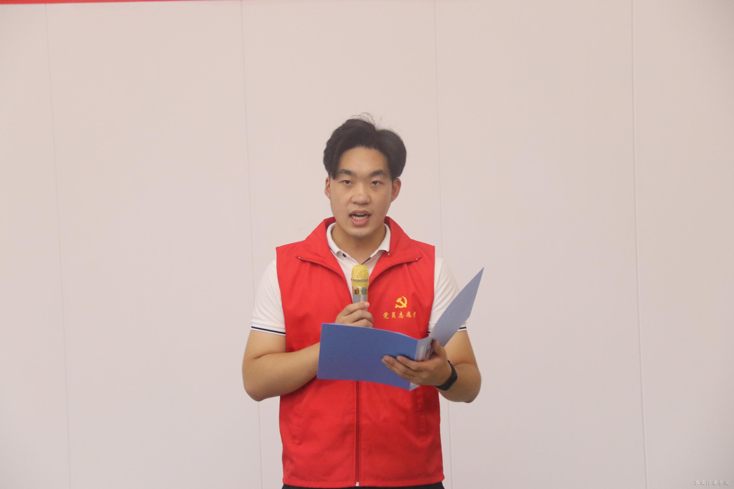 学生党员志愿者代表王翔霖同志做表态发言。他说:“当志愿者旗帜在我们面前飘扬的时候,我的内心升腾着一种光荣而神圣的使命感,为自己能够作为学生党员志愿者的一份子而自豪。”他向全体学生党员志愿者提出倡议:勤于学习,不断提升服务能力;善于创新,充分发挥青年优势;勇于担当,大力弘扬奉献精神;便民利民,用小作为展大能量。并坚信,智能学院学生党员志愿服务队一定会成为继教工党员志愿服务队后又一支“组织放心、群众满意、社会点赞”的优秀志愿服务队伍。