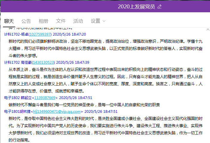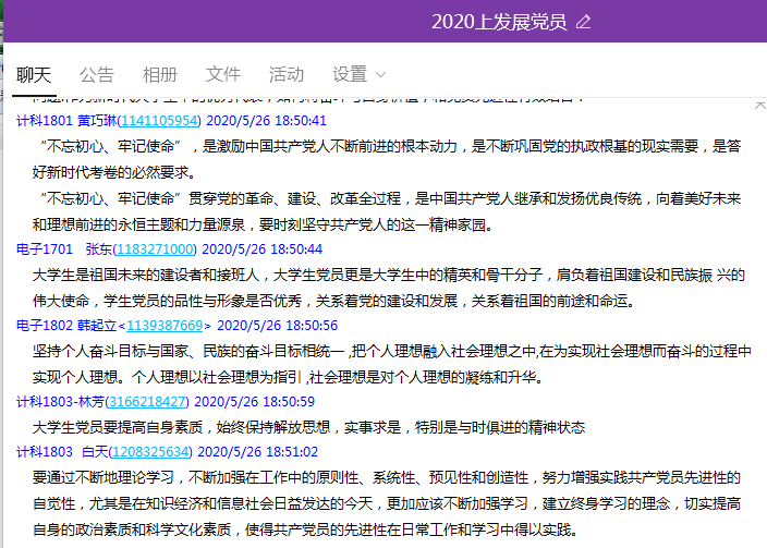 5月26日晚18:30,在第一阶段学习计划完成后,院党总支利用QQ群开展以“不忘初心,牢记使命”、 必学课程《新时代奋斗指南》为内容的线上交流研讨,学员们发言积极踊跃,交流气氛活跃。