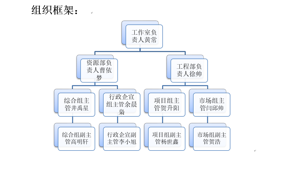 目前,M-ICT创意工作室分为二大部门——工程部和资源部,每个部门下属二个组别——工程部(项目组和市场组)、资源部(综合组和行政企宣组)。