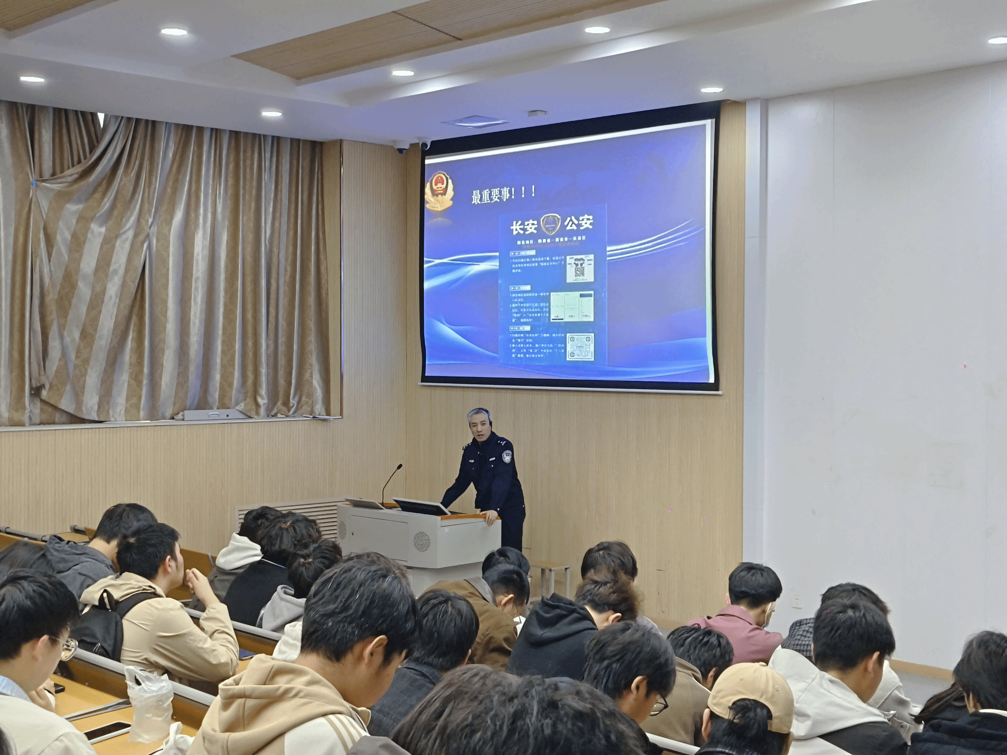2026年3月26日智能科学与工程学院联合学校后勤服务中心(党委保卫部),在 3502 教室成功举办大学生法治教育-反诈骗专题讲座。本次讲座特邀西安市公安局长安分局民警担任主讲嘉宾,为在校学生带来了一场针对性强、干货满满的反诈普法宣讲,学院百余名学生到场聆听学习。