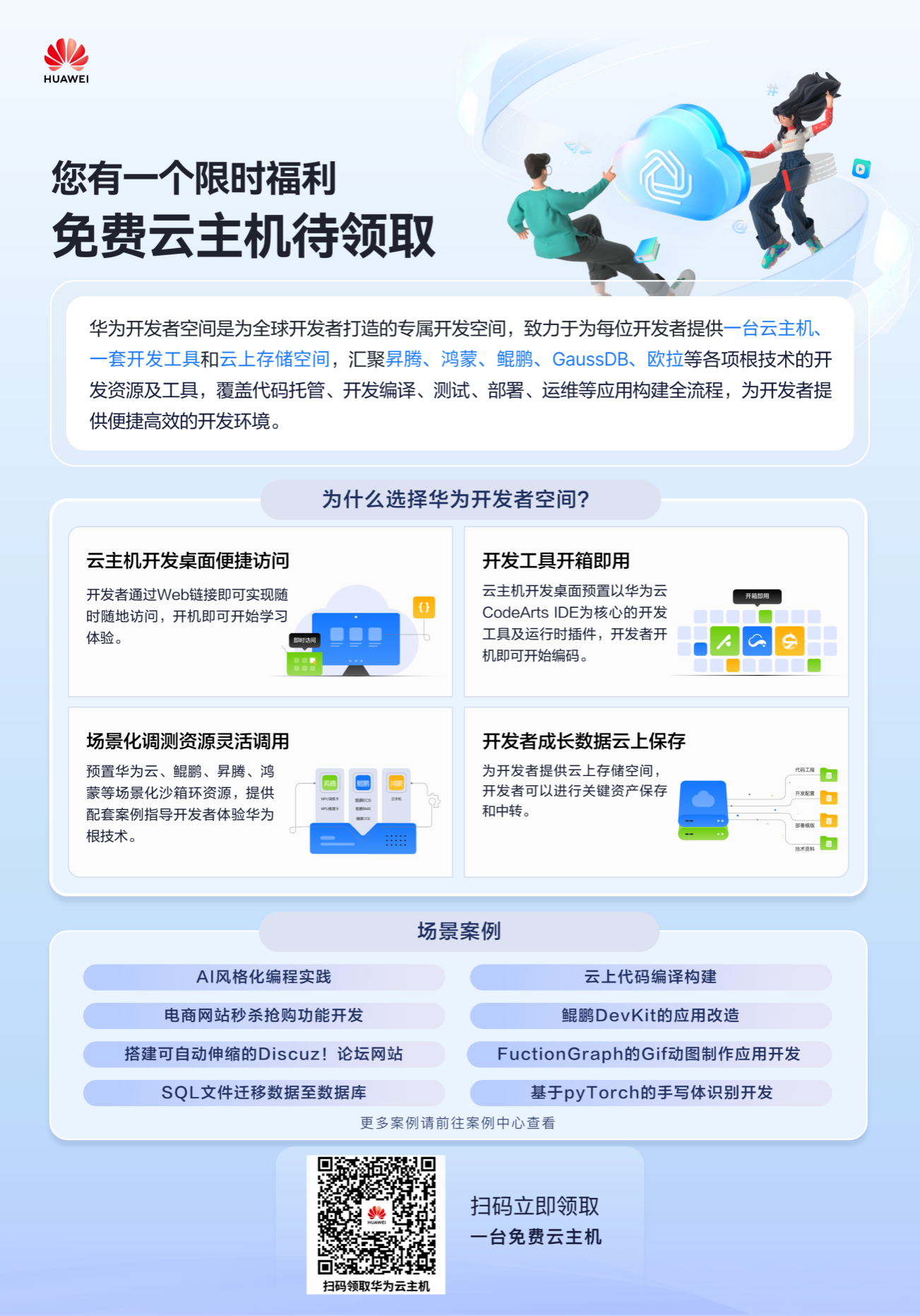 随着云计算、大数据和人工智能的发展,各个学科、专业都离不开数字技术及云开发环境。为方便师生工作和学习,经我校华为ICT产业学院与华为技术有限公司双方沟通,华为公司将为我校全体师生免费提供“华为-开发者空间云主机”,终身免费使用。