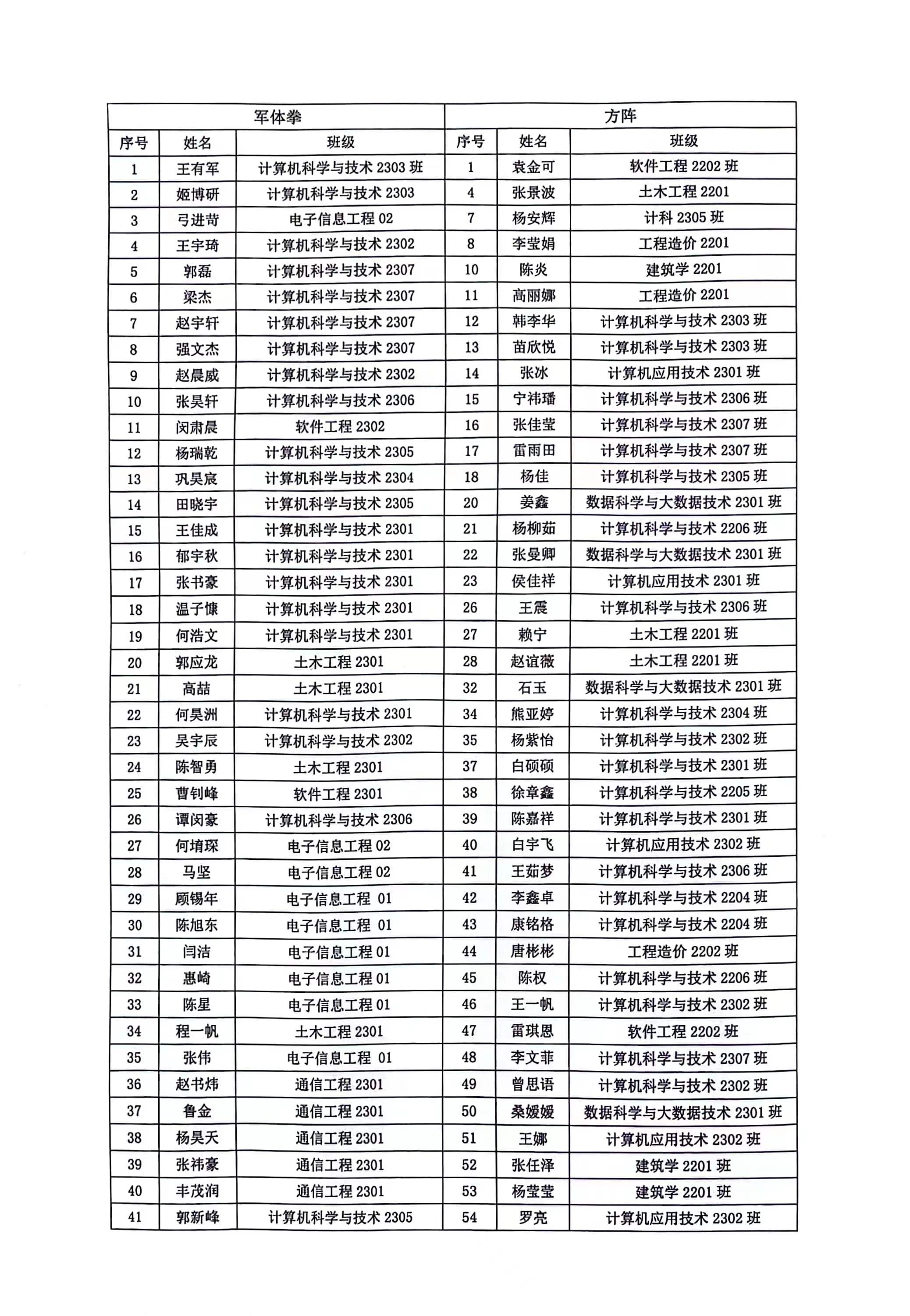 本次运动会的圆满完成,离不开所有运动员、工作人员、观众以及各位方阵和军体拳表演参与者的付出与支持。为此,共青团西安培华学院智能科学与工程学院委员会决定对本次运动会表现突出的方阵和军体拳表演参与者进行公开表彰。表彰名单如下: