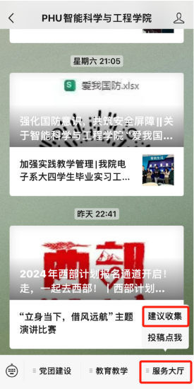 我院微信公众号持续开放意见反馈功能,收集学生关切,解决实际困难。点击PHU智能科学与工程学院微信公众号右下角“服务大厅”菜单页面的“意见收集”,填写并提交“意见反馈”(需填写联系方式,便于及时答复)。后续我院将根据反馈意见,及时协同处理,对于学生集中反映的问题,将通过微信公众号统一回复。