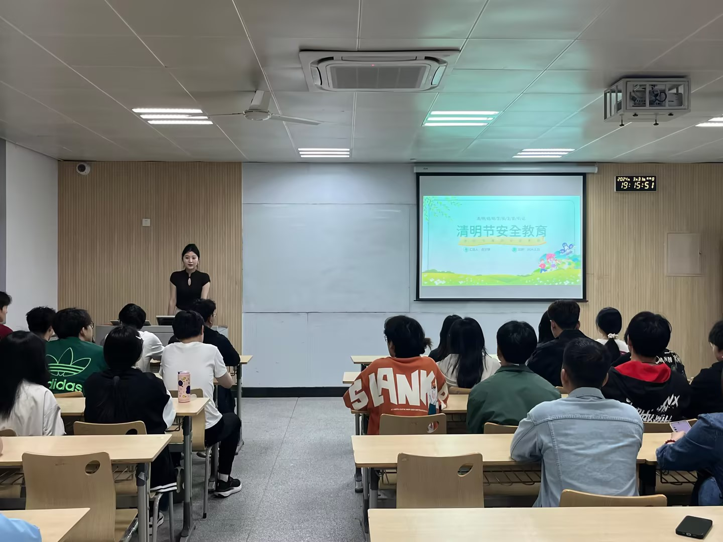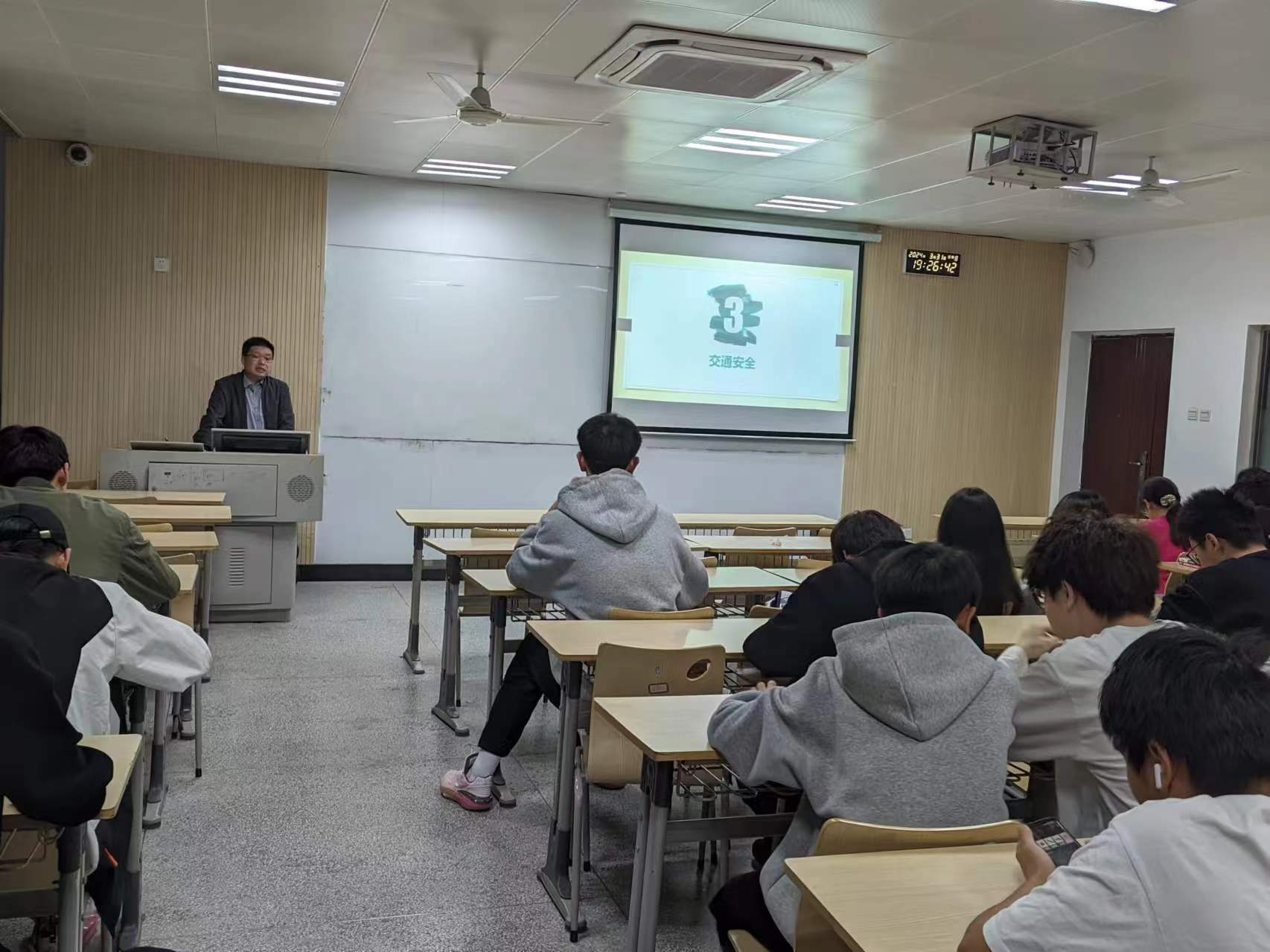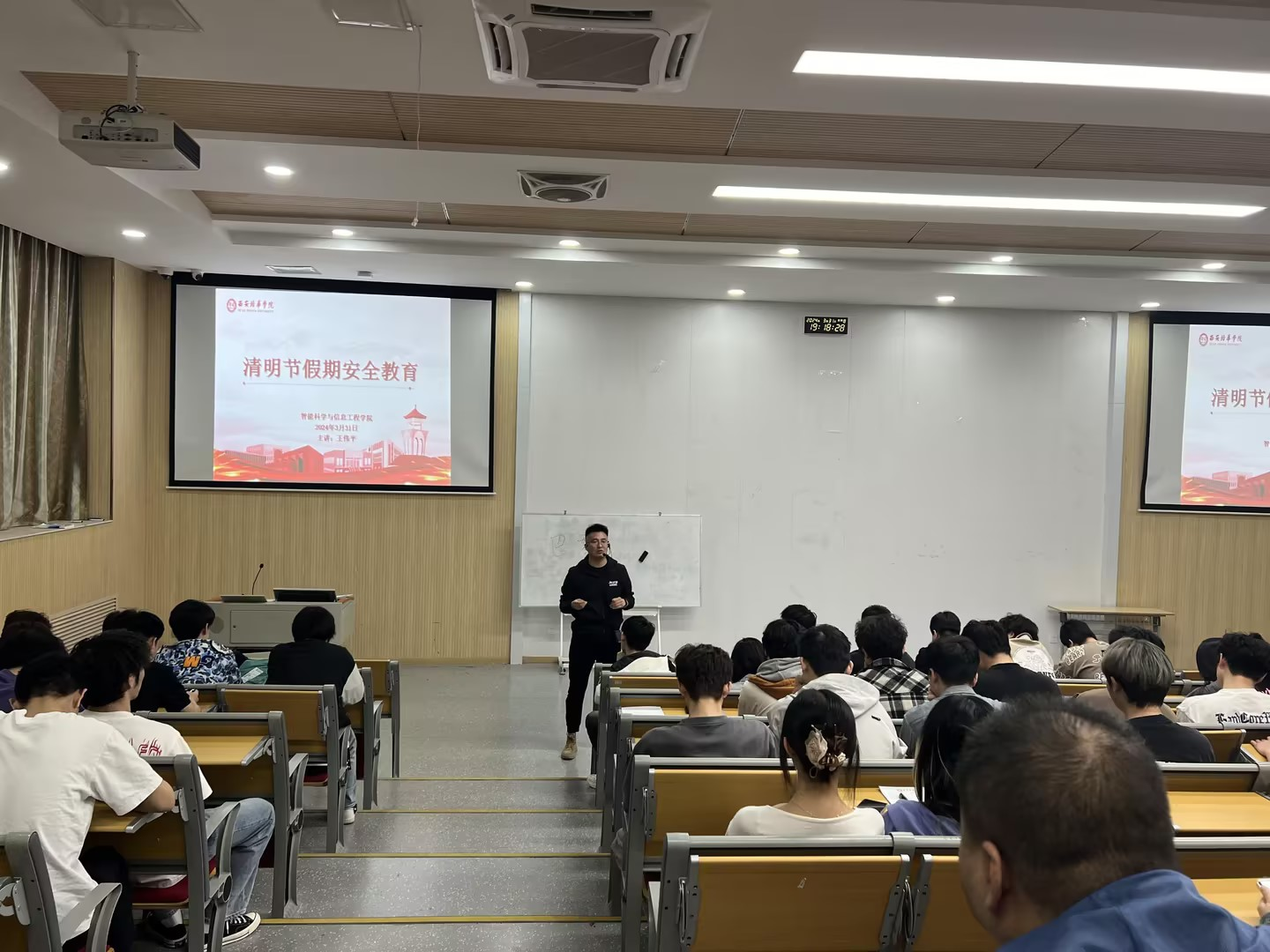 放假前,辅导员以主题班会等形式,对所有学生进行全面的安全教育。包括人身财产安全、网络安全、健康安全、交通安全、消防安全、食品安全等方面的知识。尤其是清明节外出时,通过正规渠道购买车票,不乘坐无证无牌及超载车辆,提高自身安全防范意识。