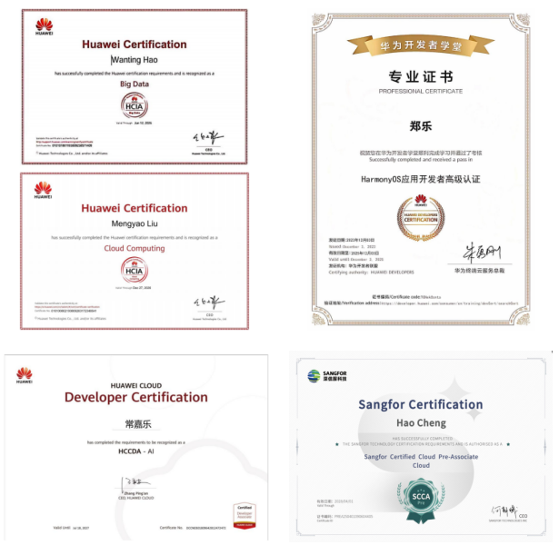 近3年,我校数据科学与大数据技术专业积极组织学生参加行业企业认证,获得华为大数据、人工智能、云计算、鸿蒙开发方向认证学生48人,其中2人获得华为HCCDP高级证书;获得深信服云计算认证学生43人;获得大数据技术应用(初级)证书学生21人。