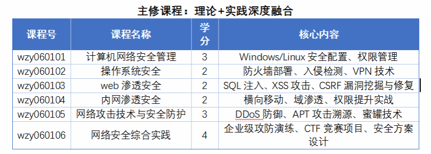 特色实践:每门课程均设置CTF竞赛、企业真实项目案例分析、攻防演练等环节。