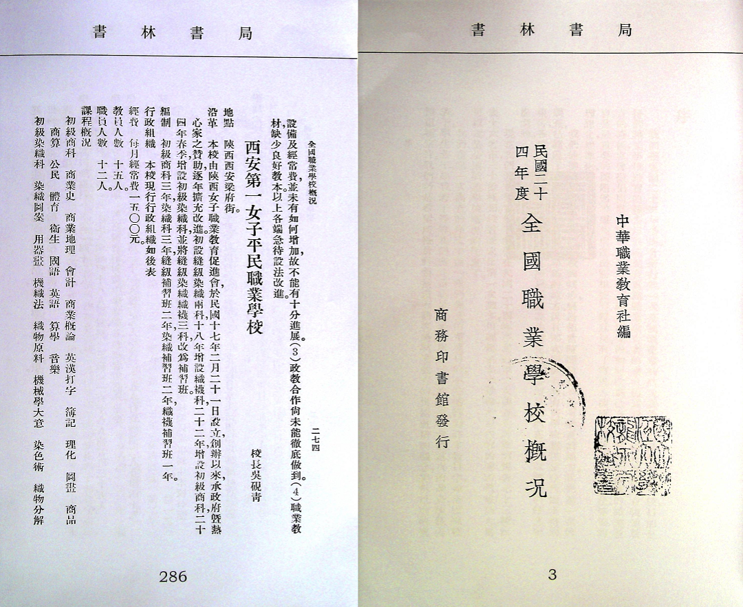 中华职业教育社编《民国二十四年度全国职业学校概况》刊载“西安第一女子平民职业学校”的校长、校址、沿革、编制、经费、教员、课程设置等概况