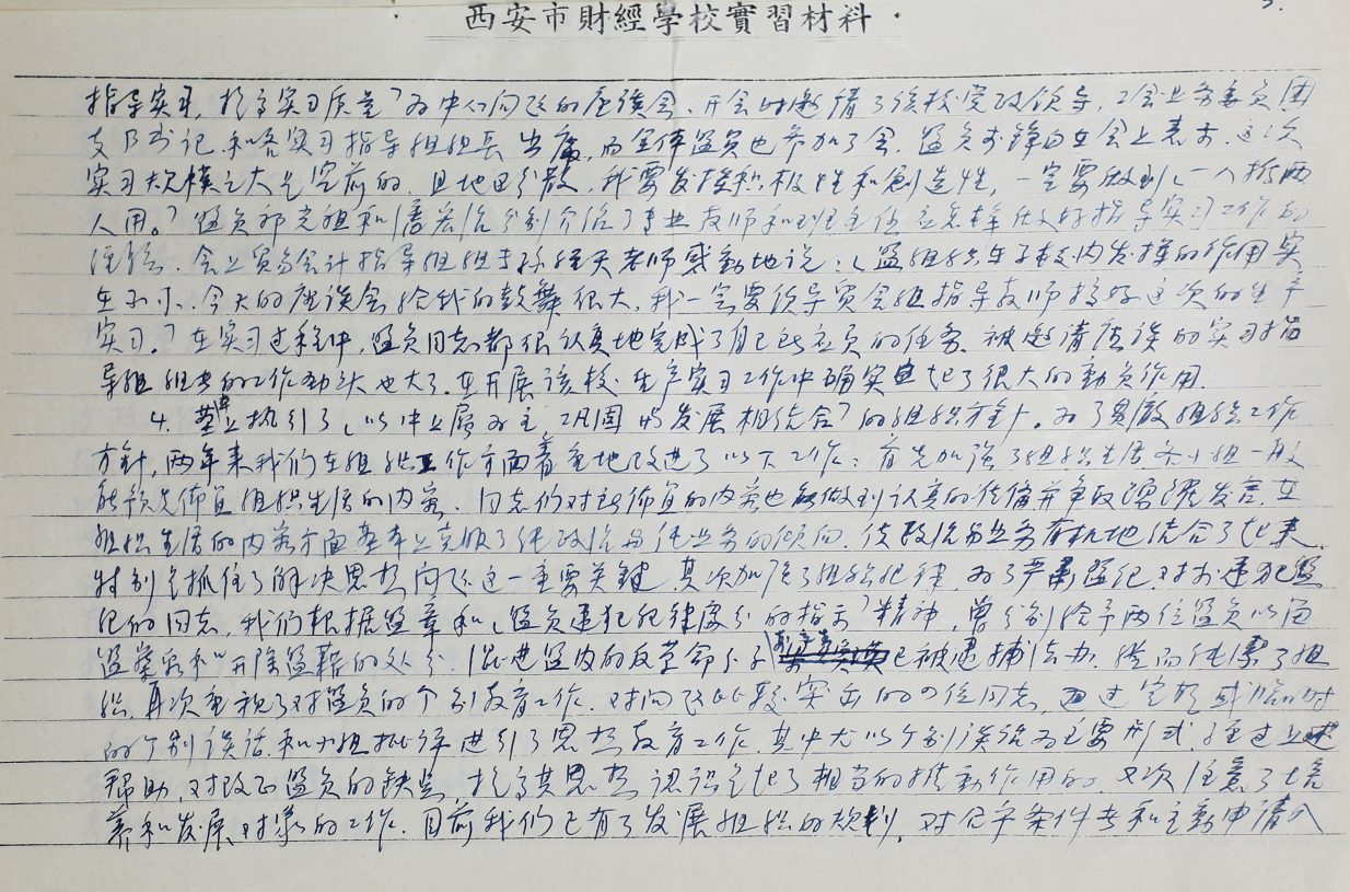 学校还找寻到一份利用西安市财经学校实习材料书写的民盟《后宰门支部改造工作报告》。《报告》中详细记录了西安市财经学校在教师队伍建设、专业教学、实习实践、思想改造等方面取得了优异成效。财校民盟小组踊跃参加中共西安市委举办的宣传辩证唯物主义和批判唯心主义的学习。经过盟务学习,盟员同志们的思想觉悟已经有了显著的提高,政治积极性日益增强,积极参加认购公债(时任西安市财经学校校长冯希勃认购最多)。财经学校教师李桂岩同志还光荣地加入了中国共产党,教师李铮白与其他小组的三位同志还被评为出席西安市先进教育工作者会议的代表。为了支援合作化运动,市财校的郭光祖、唐戴勤两位老师一年来深入农村帮助扫除文盲并开办会计人员训练班,在冰天雪地中还不辞艰辛地前往所联系的农村授课。市财校民盟小组为了做好学校55年的全校性学习生产实习工作,举行了以“如何提高教学质量”为中心问题的座谈会。盟员李铮白表示,这次实习规模之大是空前的且地区分散,我要发挥积极性和创造性,一定要做到一人抵两人用;盟员郭光祖和潘鸿治(入盟介绍人是姜维之)分别介绍了专业教师和班主任应该怎样做好指导实习工作的经验。会上贸易会计指导组组长孙经天老师感动地说“盟组织在学校内发挥的作用实在不小,今天的座谈会给我的鼓舞很大,我一定要领导贸会组指导教师搞好这次的生产实习”。在实习过程中,盟员同志们都很认真地完成了自己应负的任务。《报告》中提到的西安市财经学校的教师均是原培华职业学校的教师。值得一提的是这些教师中李桂岩、李铮白、郭光祖、唐戴勤等人后来还跟随姜维之校长远赴东北长春组建国家统计局长春统计学校,为培华的血脉延续又做出了贡献。