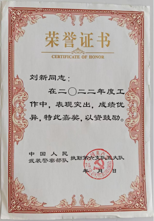 刘新于中国人民武装警察部队北京总队荣誉奖励