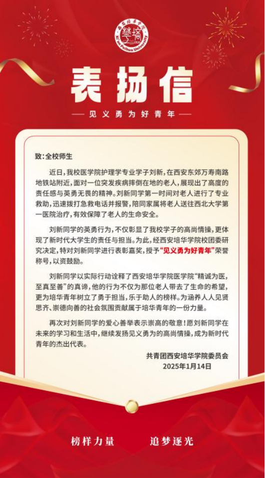 刘新同学以实际行动诠释了,西安培华学院医学院“精诚为医,至真至善”的真谛,他不仅为那位老人带去了生命的希望,更为培华青年树立了勇于担当,乐于助人的榜样,为涵养人人见贤思齐、崇德向善的社会氛围,贡献属于培华青年的一份力量,见义勇为的培华青年,好样的!