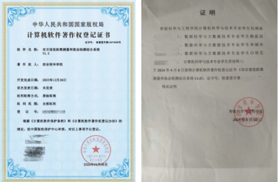 包翊成始终记得带队攻坚立项时的艰辛。在开发基于OpenCV的双目摄像头近视检测装置时,团队遭遇深度图噪点难题,他组织成员系统性梳理几十篇中外文献,连续三周一次次调整SGBM算法参数,面对参数优化过程中反复出现的误匹配率波动,他创新性地将WLS滤波引入传统SGBM算法框架,通过3个版本的程序优化逐步突破技术瓶颈,最终该项目斩获省级立项,在2024年4月获得计算机软件著作权登记证书《双目视觉距离测量和姿态检测综合系统V1.0》。