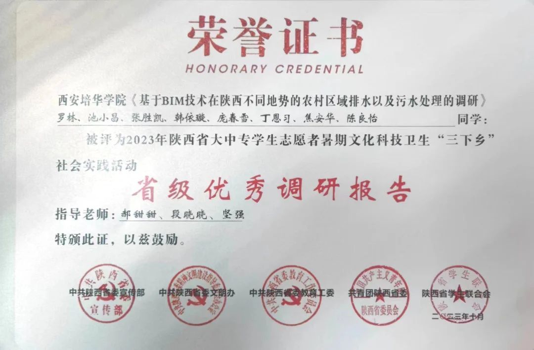 社会实践与校园活动同样为他们的成长添砖加瓦。连续三年暑假在中建七局担任施工员、技术员,40℃高温下的全站仪测量和BIM模型制作,让他们深入了解行业一线需求,将现场问题带回学校研究,完成了《基于BIM技术的陕西不同地势农村给排水研究》《陕西农村区域污水处理技术研究》等具有实践价值的论文。