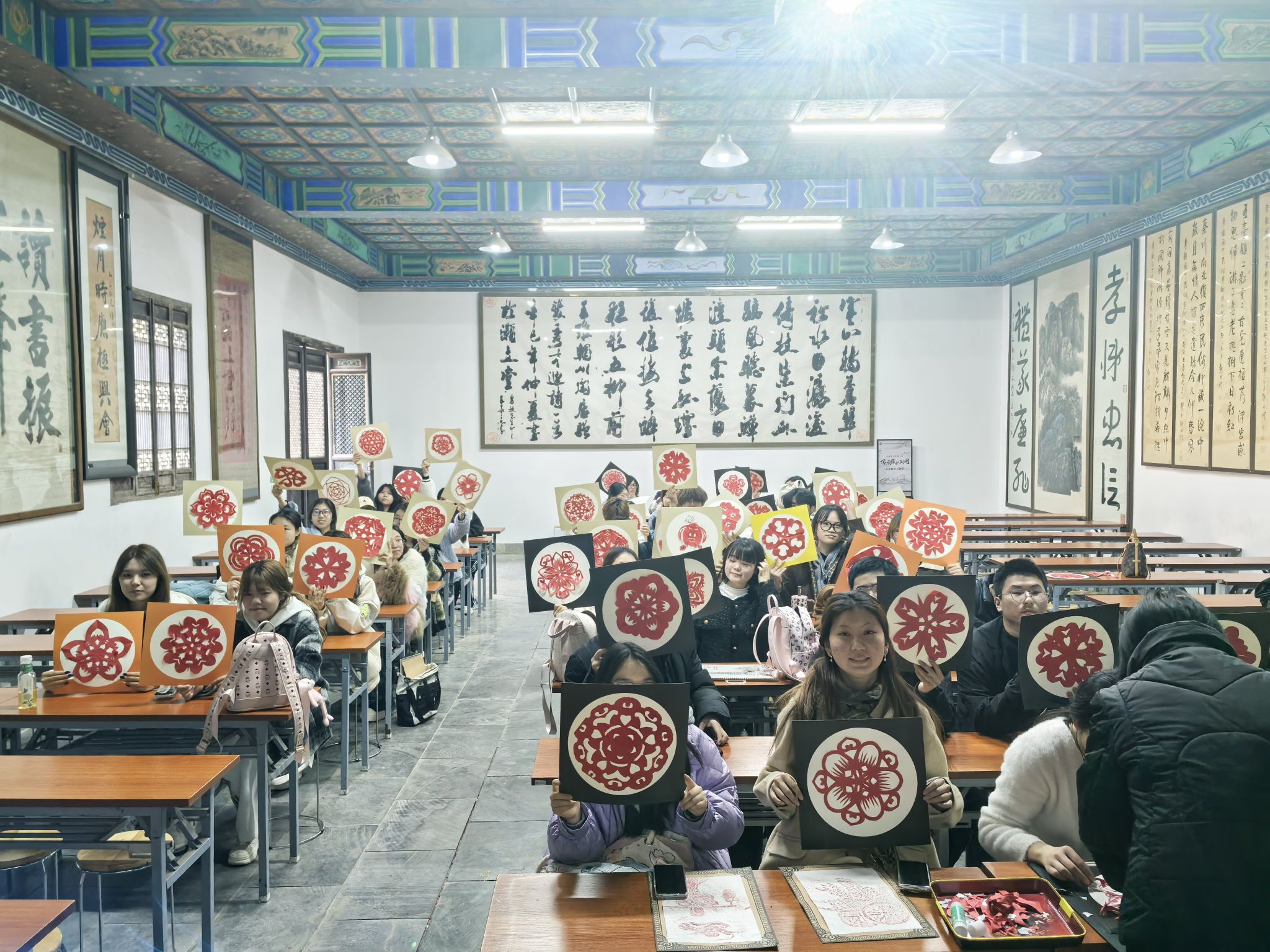 现场同学们还亲身体验了非遗剪纸、拓片技艺,在动手实践中感受传统纹样的构图巧思与制作工艺,沉浸式积累了丰富的传统文化设计素材,老师们也结合专业知识现场讲解,引导大家思考传统元素与现代服装设计的融合路径。