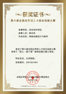近日,在第六届全国应用型人才综合技能大赛“匠心·园丁情”教师创课大赛中,我院有赵伟、张琨、张晓露、甘辉杰、陈丽娟五位老师获得二等奖,尚勇、黑梦奇、范瑞婵、陈玲琼、刘博、魏璐六位老师获得三等奖。
