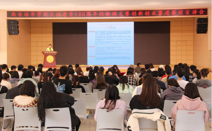 为庆祝中国共产党成立100周年,回顾党的光辉历程,讴歌党的丰功伟绩,展现我省聚力产业振兴、备战“十四运”的突出成果,推动全校上下开展弘扬传统文化、爱国主义教育,中共西安培华学院委员会主办,中共西安培华学院委员会宣传部、传媒学院承办正在举行“庆祝建党100周年短视频征集大赛”。本次赛事共分为四个赛道,为更好推动赛事,4月27日、28日赛事非遗文化传承赛道和创新创业赛道分别进行了主题宣讲。