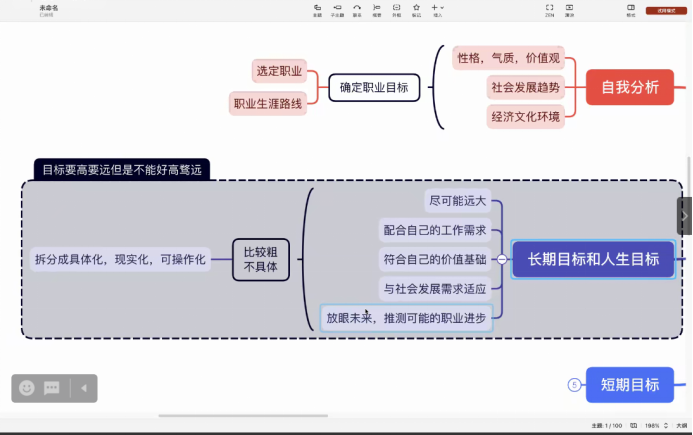 (图为“自我分析”、“长期目标和人生目标”模块)