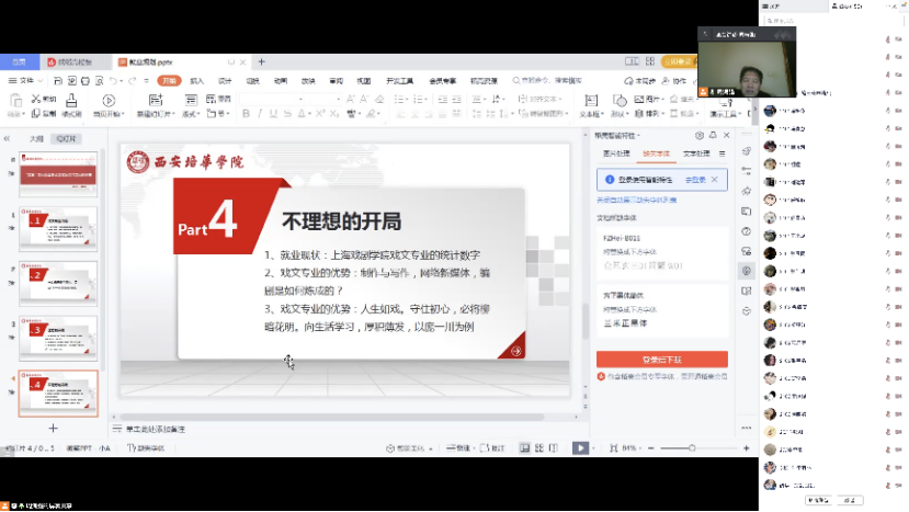 会议开始,周老师介绍了戏文专业的三个方向与就业前景,网络与新媒体的出现以及疫情的影响,目前传统的戏剧影视行业正在进行大的转型,就业方向也相应的发生了一些变化,出现了很多新的岗位,影视行业的就业前景可观,学生们需要改变传统的就业观,紧跟时代,使自己的未来就业有更加广阔的前途。