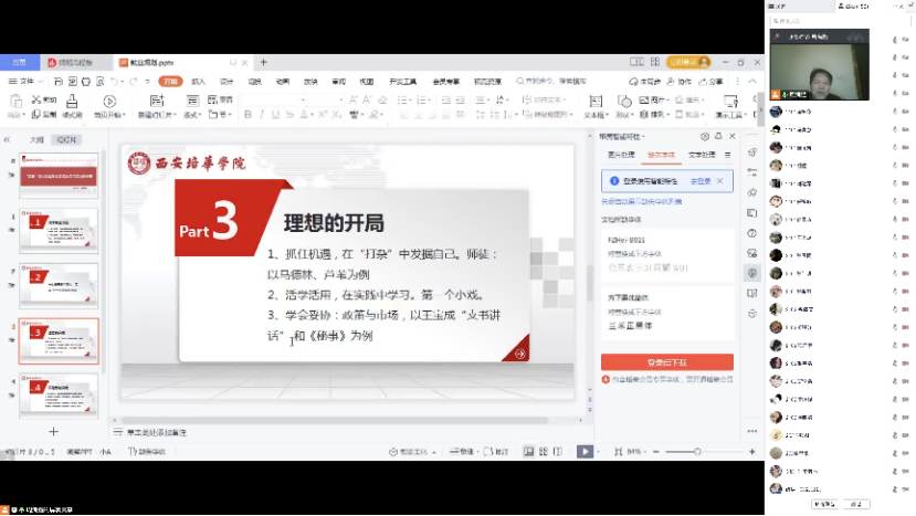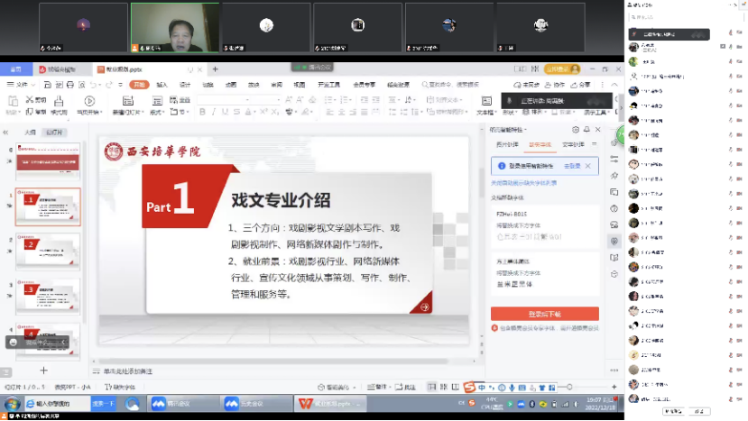 2022年12月18日,2021级戏剧影视文学专业职业生涯规划与就业指导(二)课程第五讲在腾讯会议上进行,本期主题为“初入职场如何处理理论知识与工作实际之间的冲突”,由专业带头人周满强老师主讲,传媒学院2021级戏剧影视文学全体同学参会。