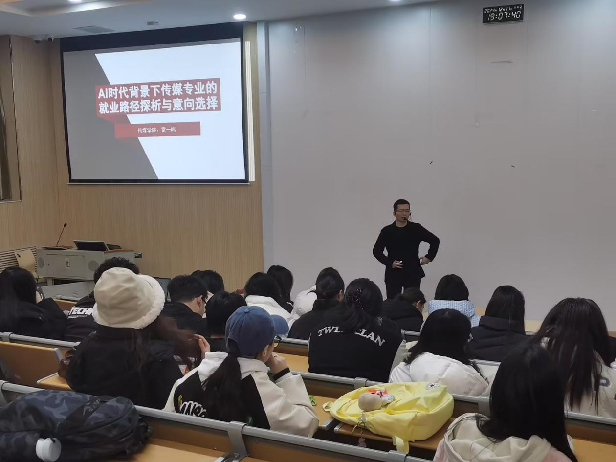 最后一场讲座在12月10日举行,主题为“AI时代背景下的传媒专业就业路径探析与意向选择”。由广播电视编导专业教师雷一鸣老师进行分享。雷老师以他丰富的学识和独到的见解,探讨了未来可能出现的新兴职业方向。他指出,随着AI技术的不断发展,传媒行业将迎来前所未有的变革和机遇。他鼓励学生们积极适应技术变革,拓宽职业视野,勇敢地探索未知的领域。