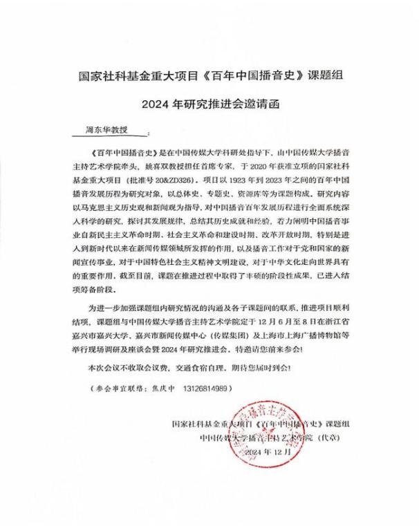 (国家社科基金重大课题《百年中国播音史》项目推进会邀请函)