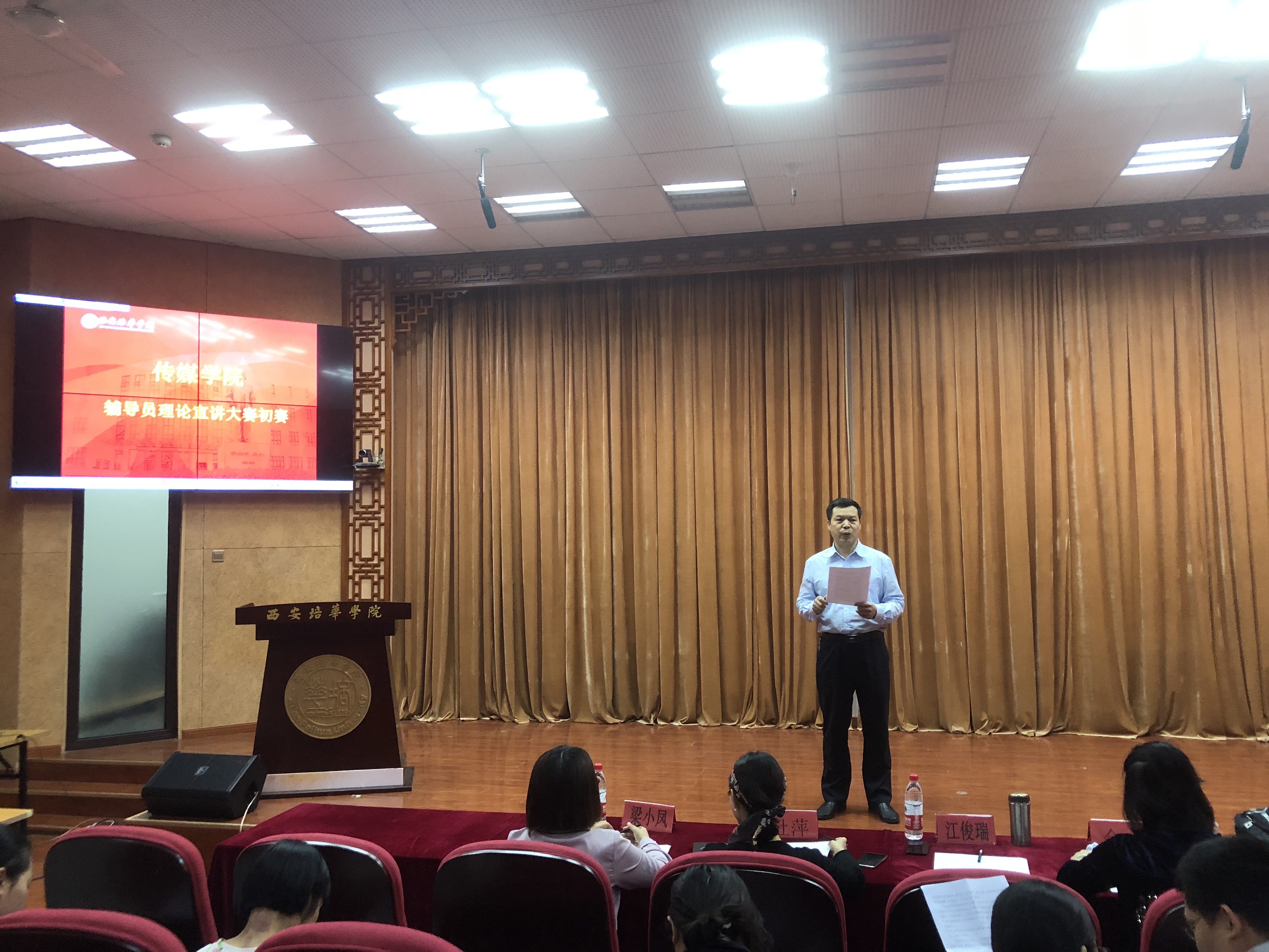 为深入贯彻落实全国高校思政工作会议精神进一步加强我院辅导员理论思想高度、政策解读能力和演讲宣传水平。提升我院辅导员开展大学生思想政治教育工作质量。2018年5月23日传媒学院辅导员理论宣讲比赛在国学大讲堂顺利进行,传媒学院全体辅导员参赛。行政副院长江俊瑞、院长助理杜萍、新闻专业负责人梁小凤和播音专业教师余文担任评委。