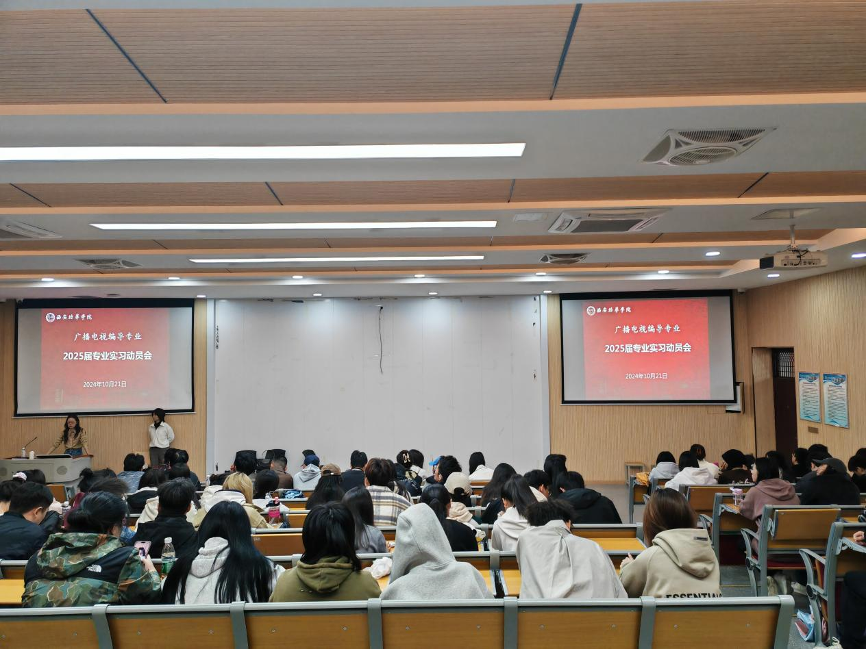 10月21日,2025届广播电视编导专业4个班,共计150余名同学在3507组织召开了“专业实习动员大会”。戏剧影视系副主任邱晓波、广编专业教师晋珊珊、李瑾、雷一鸣共同组织参与。四位老师作为此次《专业实习》课程的任课教师,分别就课程实施方案、校企合作企业介绍、现场提问等具体情况作了讲解与答疑。通过此次动员会,2025届与会学生对于“专业实习”有了更为清晰和深刻的认识,同时学生们也做了表态,将以积极主动的学习姿态,投入到此次专业实习,并且以实践成果来反馈学院。