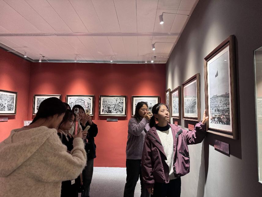 在参观过程中,学生们积极互动,与王楠老师深入讨论每张照片的构图、光线、色彩等摄影技巧,以及照片所传达的情感和信息。这种互动学习的方式,让学生们在感受历史的同时,也对新闻摄影有了更深的理解和认识。